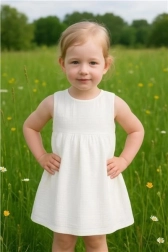 Lagan i prozračan mušelinski haljinica za bebe brenda New Baby osigurava cjelodnevnu udobnost. Bez rukava, kroj u obliku A s nabrnom suknjom i kopčanjem na druker na leđima za lako oblačenje. Izrađeno od 100% pamučnog mušelina – nježno, mekano i postojano čak i pri čestom pranju.