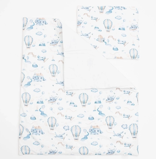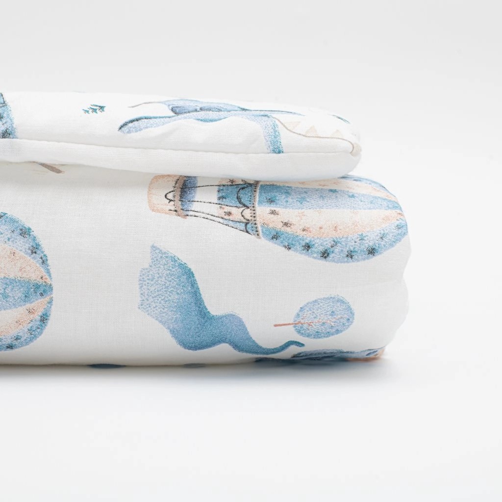 Stilisan i udoban set za kolica New Baby Romance razveselit će svaku mamu i bebicu. Sadrži jastučić i poplun s tiskom bajkovite pustolovine među oblacima. Ušiven je od visokokvalitetne 100% pamuka i ispunjen antialergijskim vlaknom, koje je sigurno za osjetljivu kožu. Mek, topao i prozračan materijal osigurat će miran san na putovanjima.
