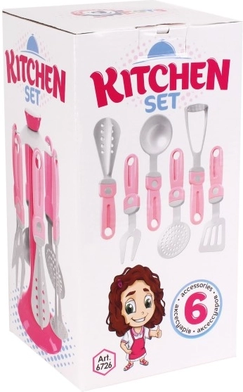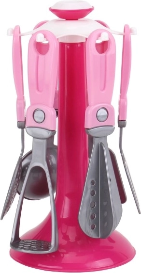 Ako volite dizajnerske predmete, onda vam kod kuće ne smije nedostajati ovaj originalni stalak s kuhinjskim priborom za male domaćice. Nezaobilazan dodatak za sve male kuharice i pomoćnice u kućanstvu ili za djevojčice koje žele skuhati nešto ukusno svojim lutkama. Set sadrži 6 komada pribora zajedno s praktičnim stalkom, tako da će vam sve biti pri ruci. Sve je izrađeno od kvalitetne i neškodljive plastike. Pogodno za djecu od 3 godine.