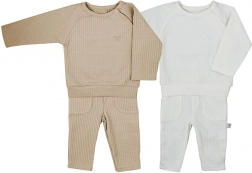 Stilisan dvodijelni bebi set KOALA Bello u bež boji spaja udobnost i moderan izgled. Sadrži majicu s dugim rukavima na drukere i trenirku s elastičnim pojasom i džepovima. Od novog materijala s teksturiranim uzorkom za maksimalnu udobnost i slobodu pokreta.