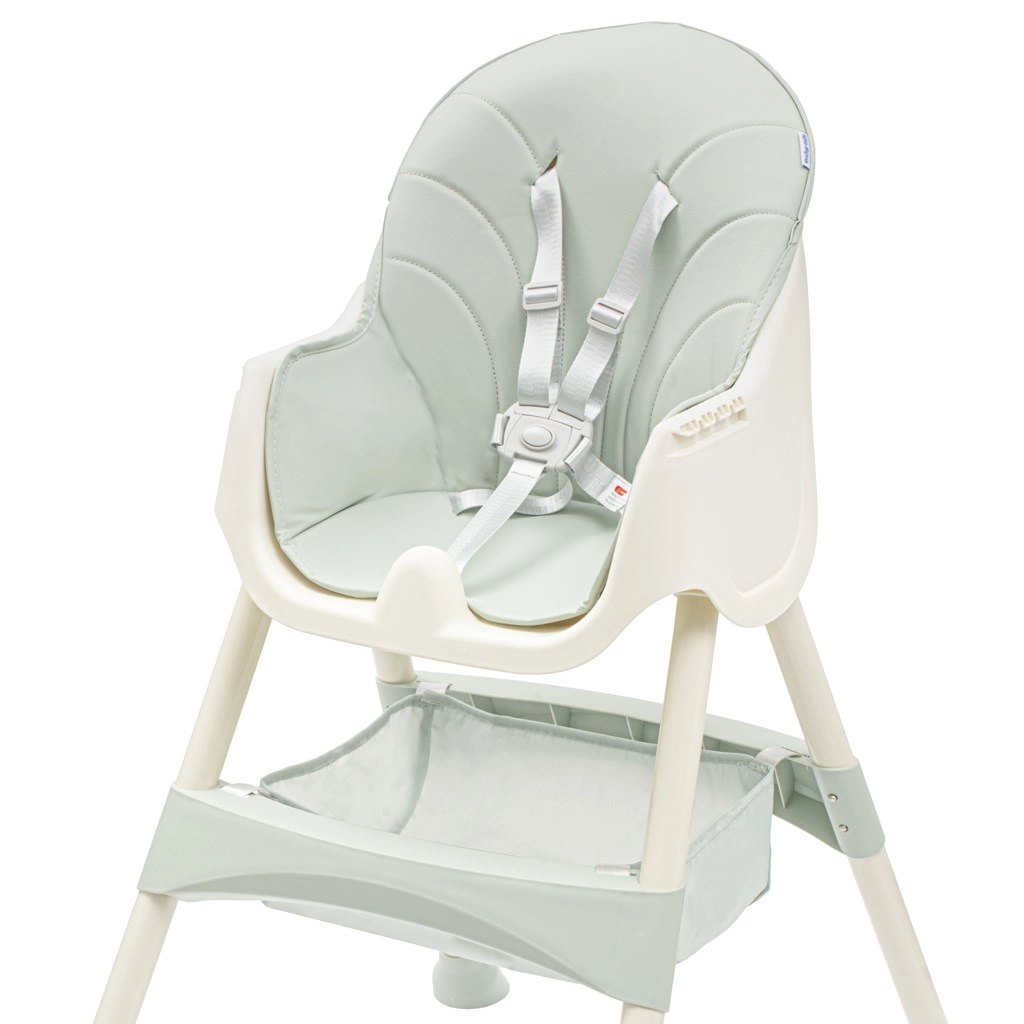 Stabilna konstrukcija s protukliznim završecima nogu sprječava neželjeno pomicanje, a oslonac za noge povećava udobnost sjedenja. Praktična platnena košara ispod sjedala prima sve potrebno – od maramica do malih igračaka. Jednostavnom demontažom donjeg dijela nogu hranilicu brzo pretvorite u nisku stolicu za igru ili samostalno sjedenje.