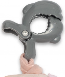 Praktična siva kopča s čvrstim prihvatom osigurava stabilno i pouzdano pričvršćivanje na ručku kolica, dršku autosjedalice ili na krevetić. Igračka tako uvijek ostaje na mjestu i u dosegu bebe.
