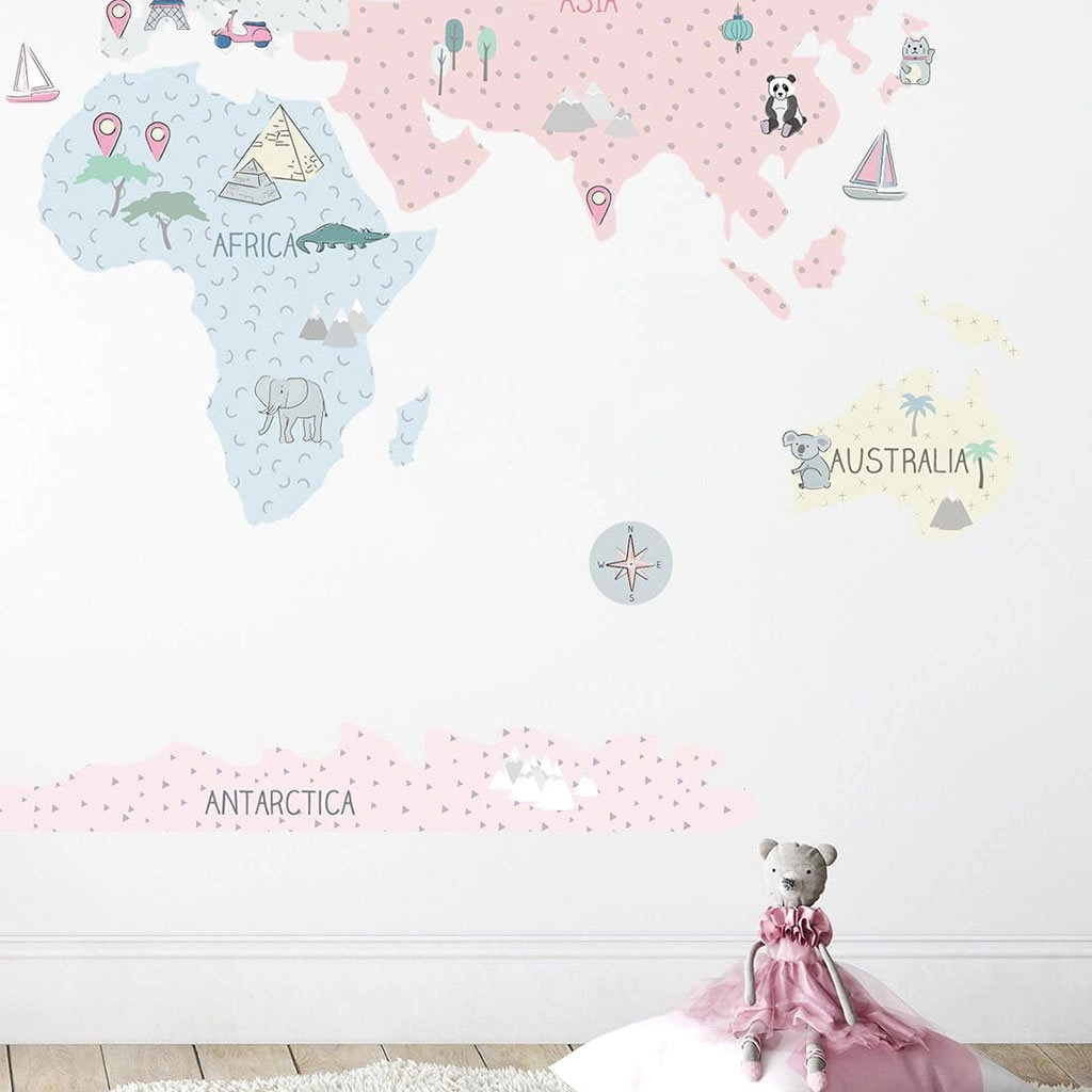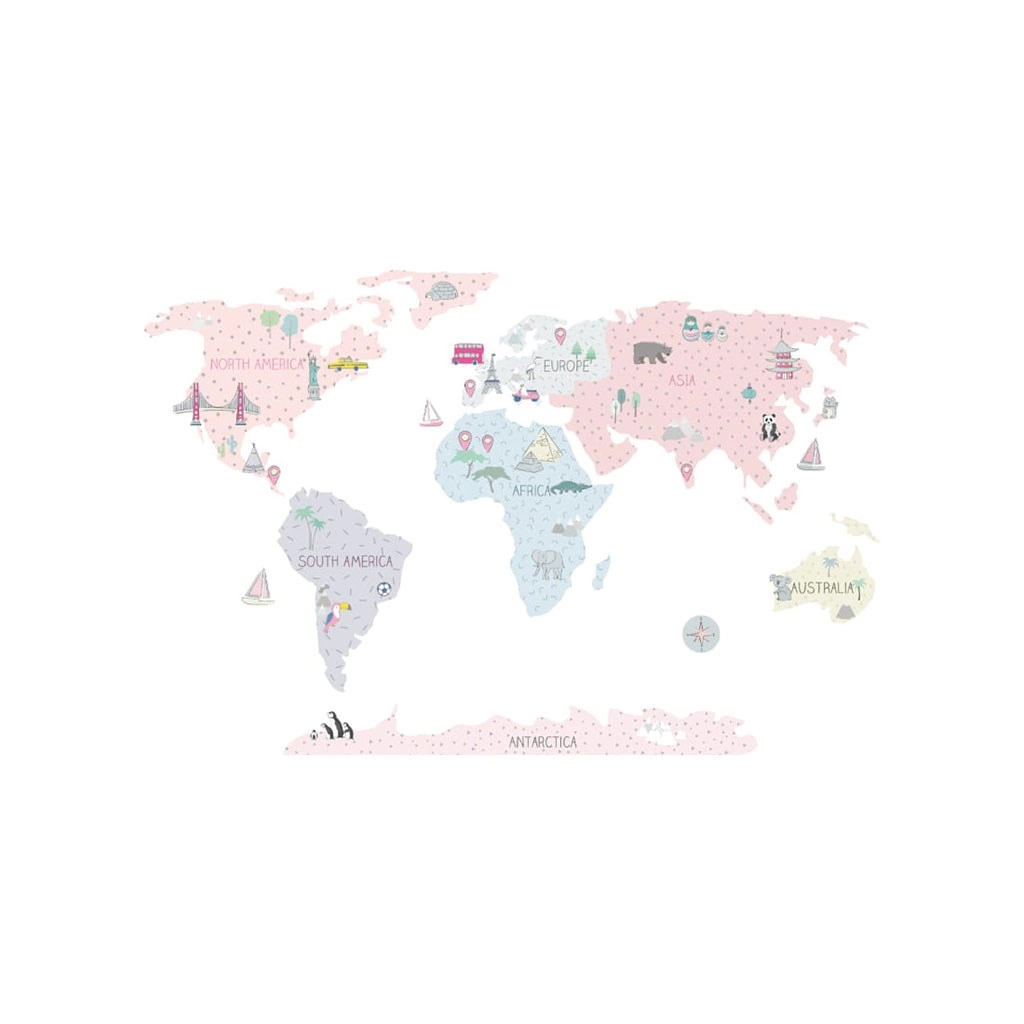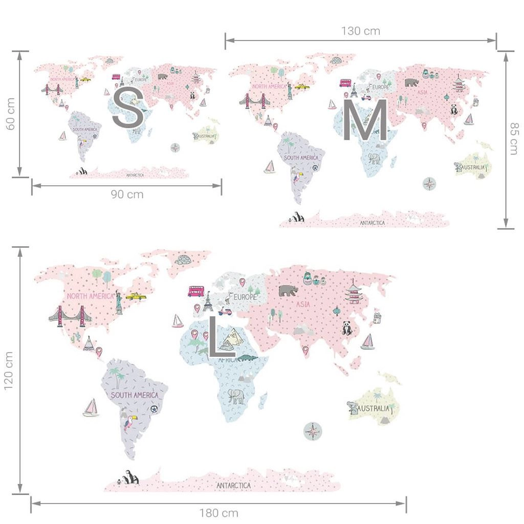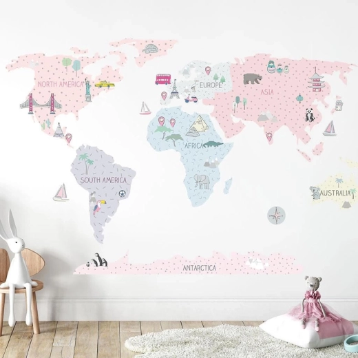 Otkrijte čaroliju učenja kroz igru s prekrasnom zidnom naljepnicom karta svijeta L u ružičastim pastelnim tonovima. Ova dekoracija u skandinavskom stilu oživjet će svaku dječju sobu, donijeti edukativne elemente (kontinenti, oceani, strane svijeta, znamenitosti) i zahvaljujući mat laminatu otporna je na ogrebotine i lako se lijepi. Svaki je element izrezan zasebno za jednostavnu aplikaciju i u većim prostorima.