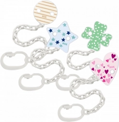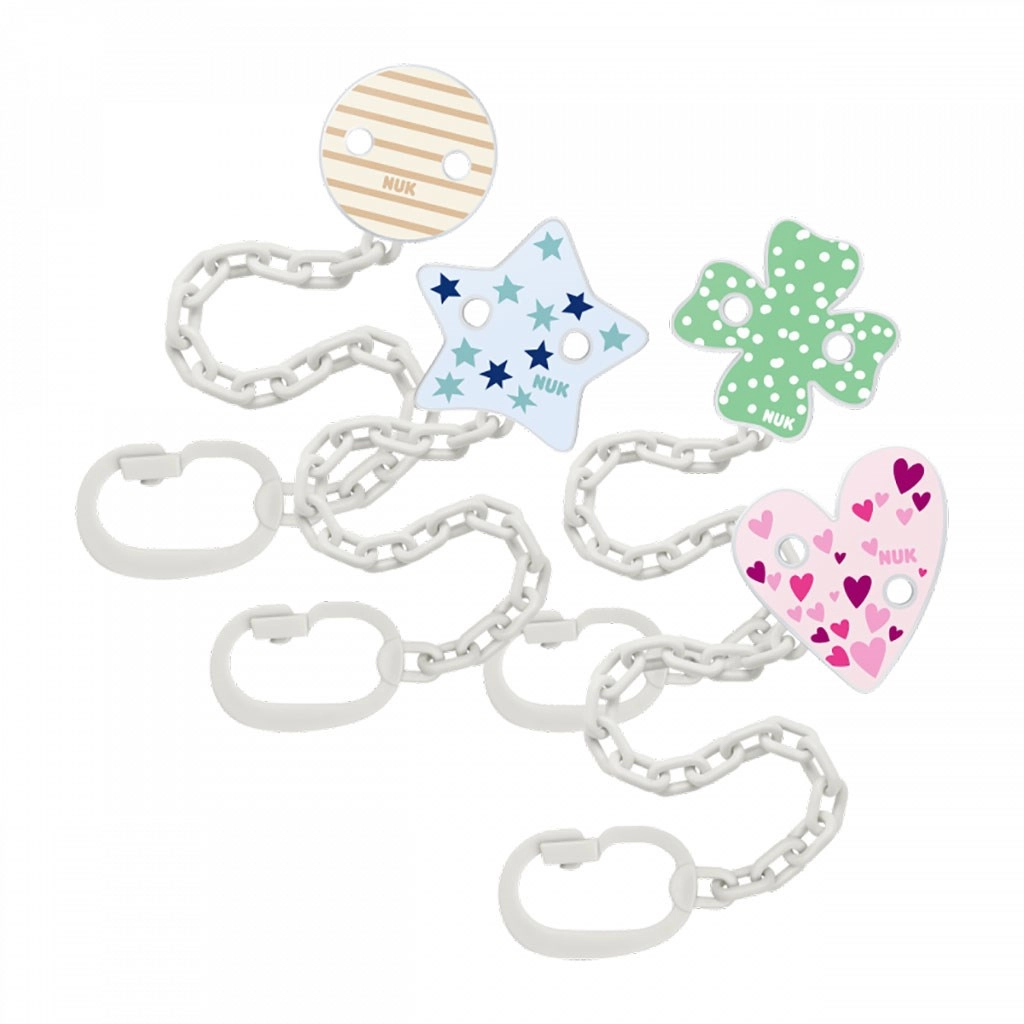 Lančić za dudu s kopčom NUK osmišljen je tako da dudu uvijek drži pri ruci i čistom. Praktična kopča lako se pričvrsti na dječju odjeću i drži čvrsto, pa se duda ne gubi ni tijekom šetnji ni na putovanjima. Živopisne boje i veseli motivi potiču vizualnu percepciju i privlače pažnju i najmlađih beba.