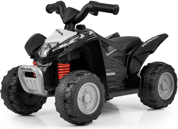 Licencirani dječji četverocikl HONDA ATV od MILLY MALLY je mini replika modela TRX 250X, koja spaja sportski dizajn, sigurnu konstrukciju i jednostavno upravljanje. Nakon pritiska na papučicu vozilo kreće i pali se prednje svjetlo, široke terenske gume osiguravaju stabilnost, a čelične osovine izdržljivost. S trubom, udobnim profiliranim sjedalom i baterijskim pogonom idealan je za male vozače od 24 mjeseca.