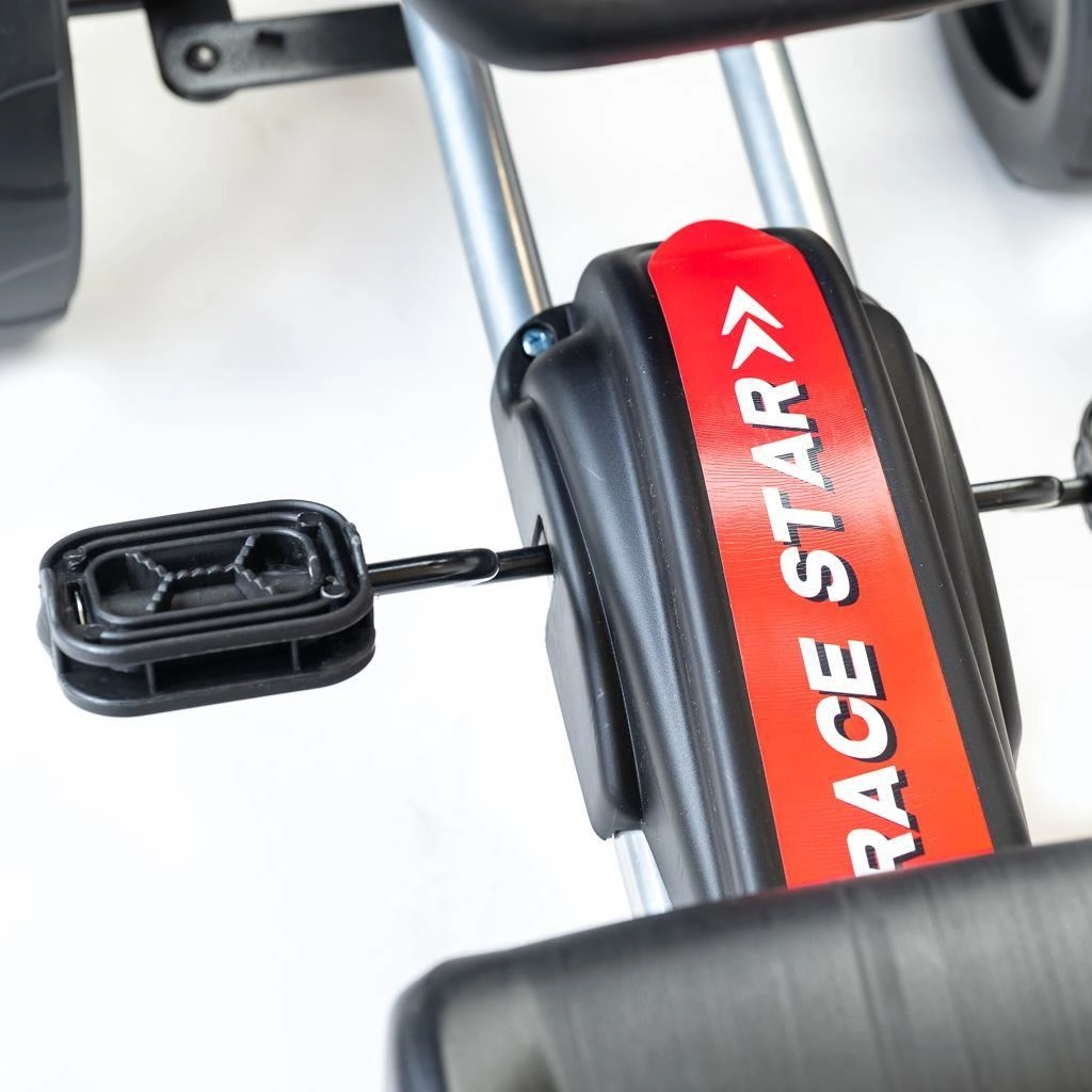 Praktični lančani pogon s funkcijom naprijed/natrag omogućuje jednostavno upravljanje, dok podesivo sjedalo (2 položaja) raste zajedno s djetetom. Karting ispunjava europske sigurnosne norme, ima sportski volan, plastične pokrove i zaštite za veću sigurnost i izdržljivost.