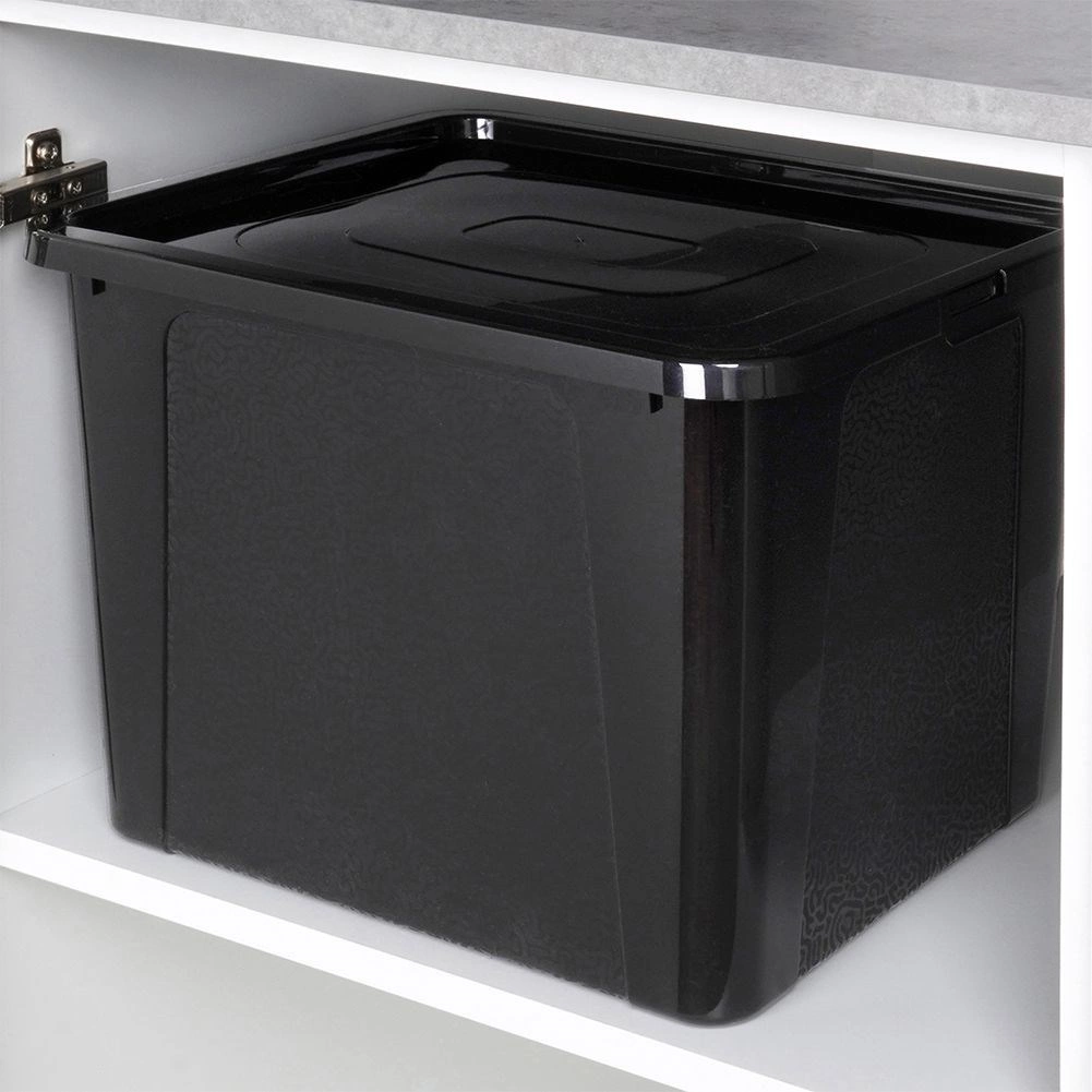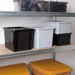 Praktična kutija za pohranu s poklopcem zapremine 30 l pomaže održati red u svakom kućanstvu. Izdržljiva je i lagana, izrađena od kvalitetne plastike u crnoj boji, a zahvaljujući poklopcu na klik štiti sadržaj od prašine i vlage. Idealna za dom, ured, radionicu i garažu, s decentnim ukrasom za stilsku organizaciju.
