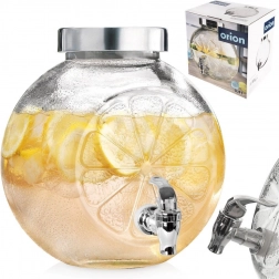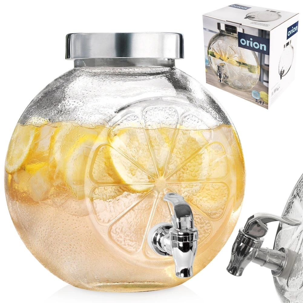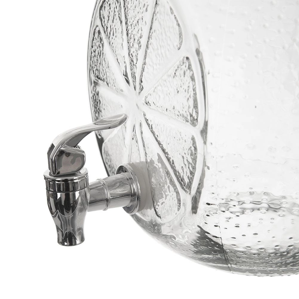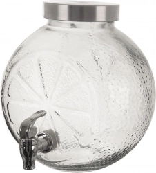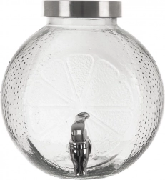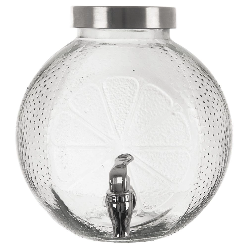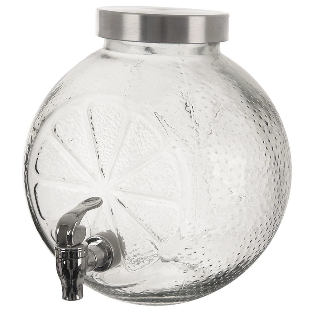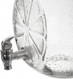 Velikozapremni stakleni dozator s pipcem elegantno poslužuje vodu s voćem, limunadu i osvježavajući punč. Debelo, kvalitetno staklo s reljefom kriški citrusa sigurno je za hranu te osigurava atraktivan izgled i čvrstoću. Navojni metalni poklopac štiti sadržaj od nečistoća i insekata, dok metalni pipac omogućuje praktično točenje bez prolijevanja.
