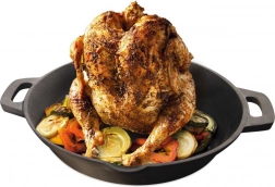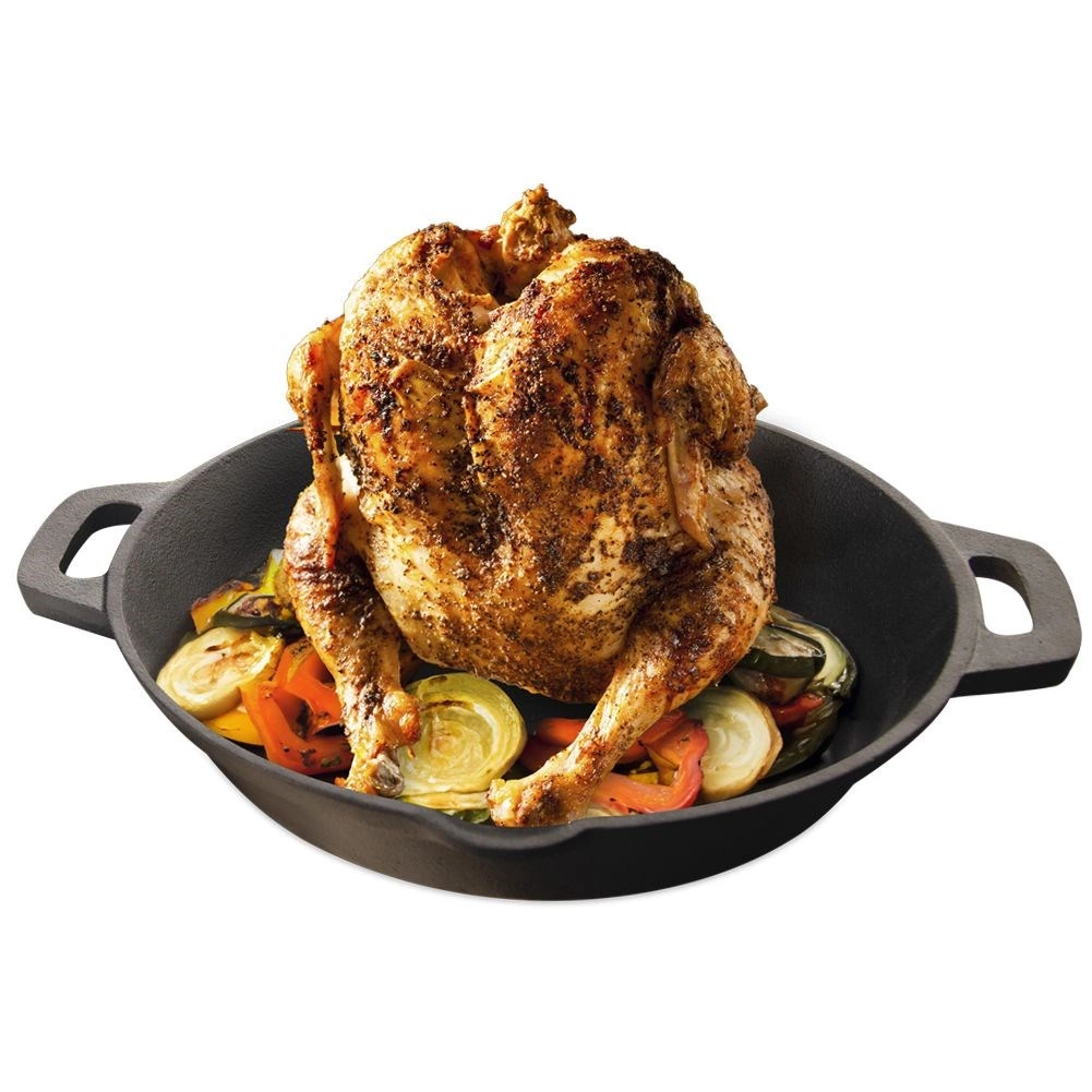 Ova masivna tava od litine s integriranim stalkom stvorena je za savršenu pečenu piletinu – i u stilu “pivo pod piletinom”. Središnji klin može se napuniti pivom ili vinom za ekstra sočnost i aromu, a oko njega se udobno smještaju krumpir ili povrće. Litina osigurava ravnomjernu distribuciju topline i dugo je zadržava, tako da jelo ostaje dulje toplo.