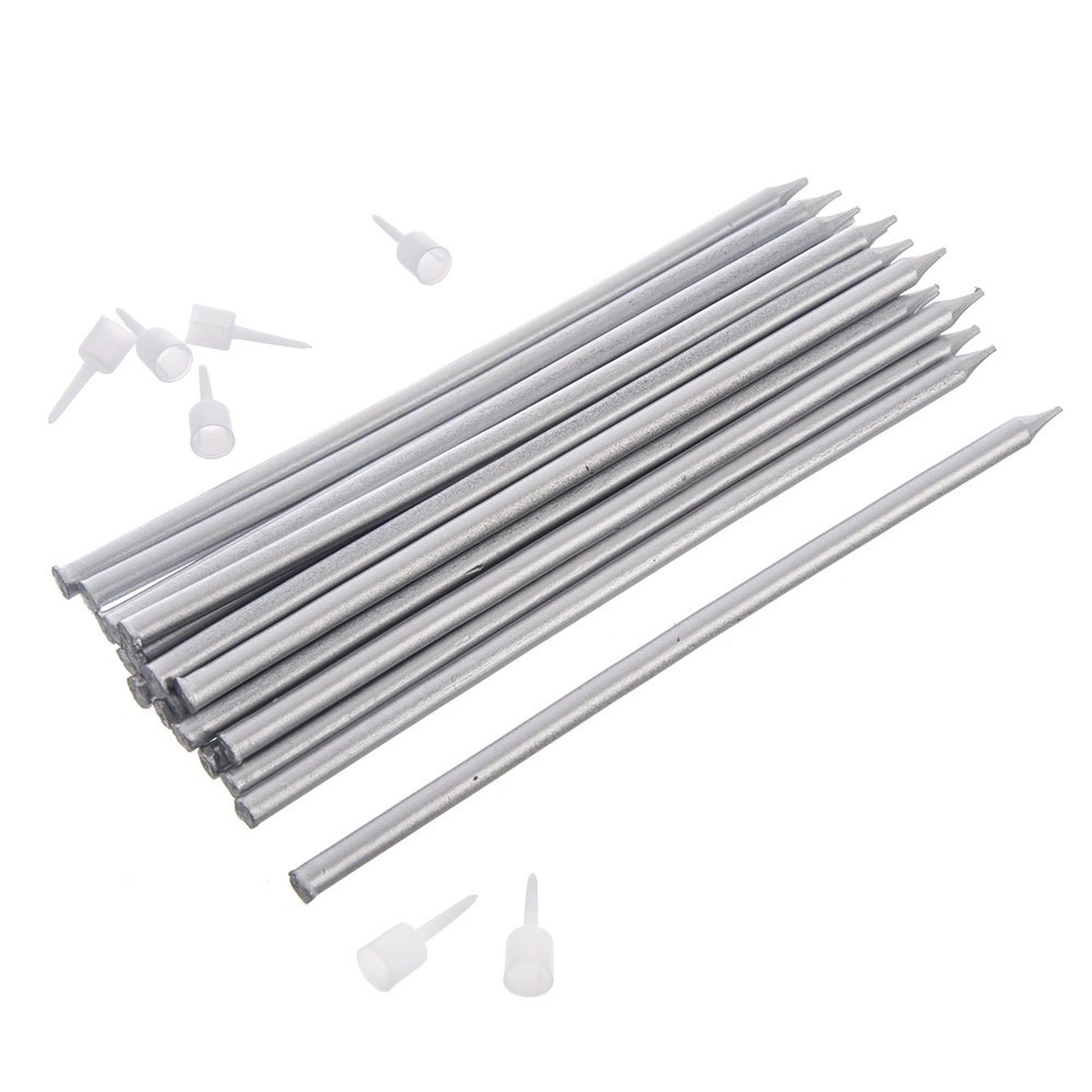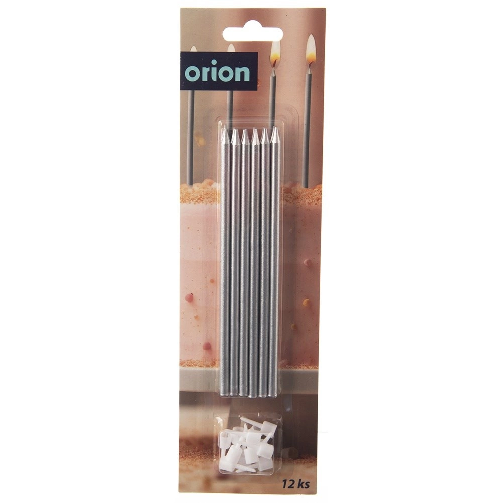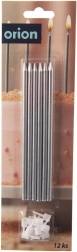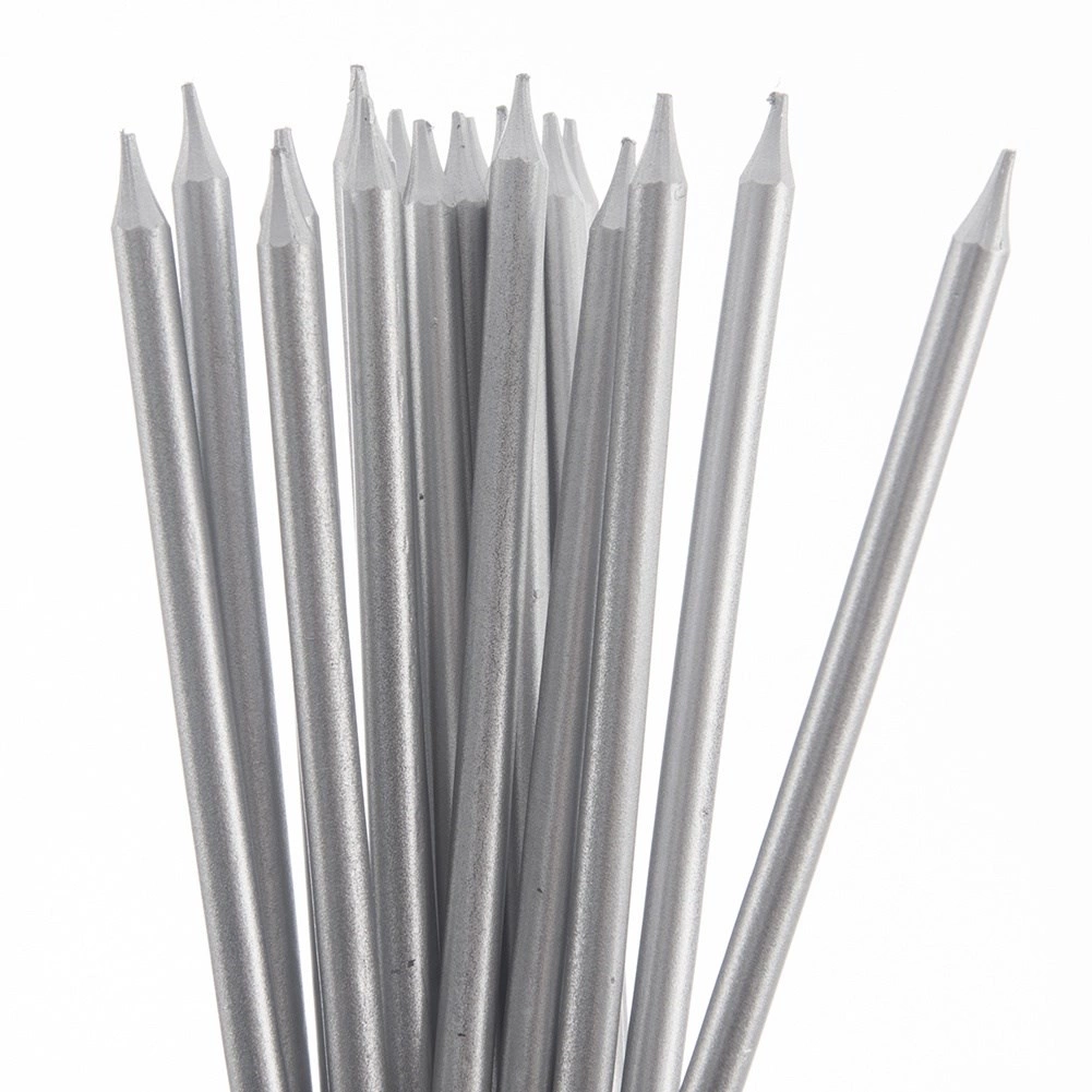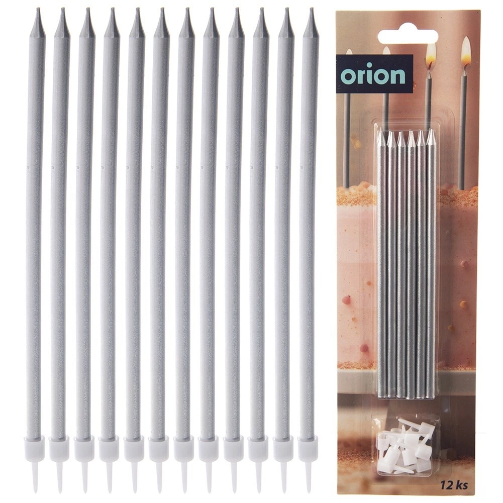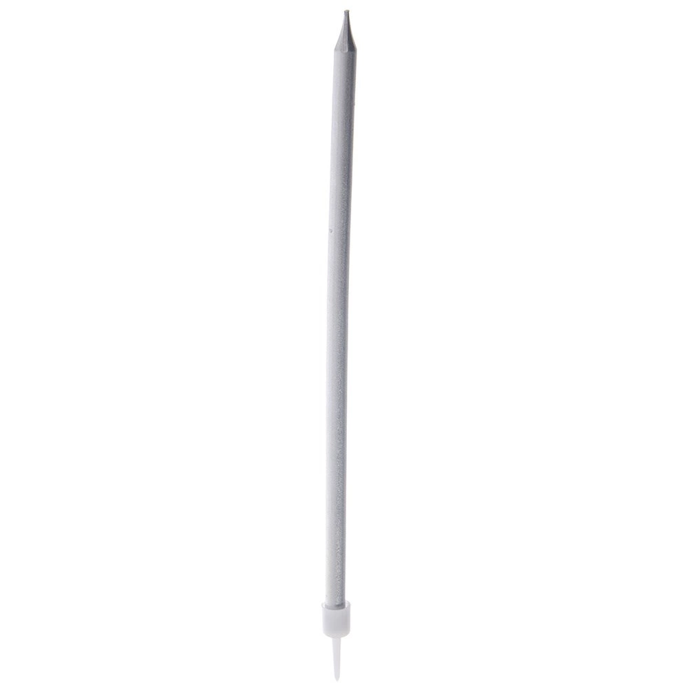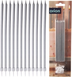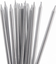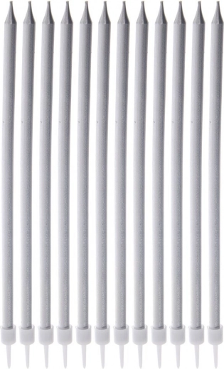 Elegantni set od 12 dugih svjećica za torte u metalik srebrnoj boji, visine 14,5 cm, za svečane torte i deserte. U pakiranju su bijeli plastični držači za stabilno učvršćivanje. Svjež dizajn i efektna visina daju svakoj proslavi poseban izgled. Univerzalna srebrna boja pristaje svakoj torti.