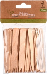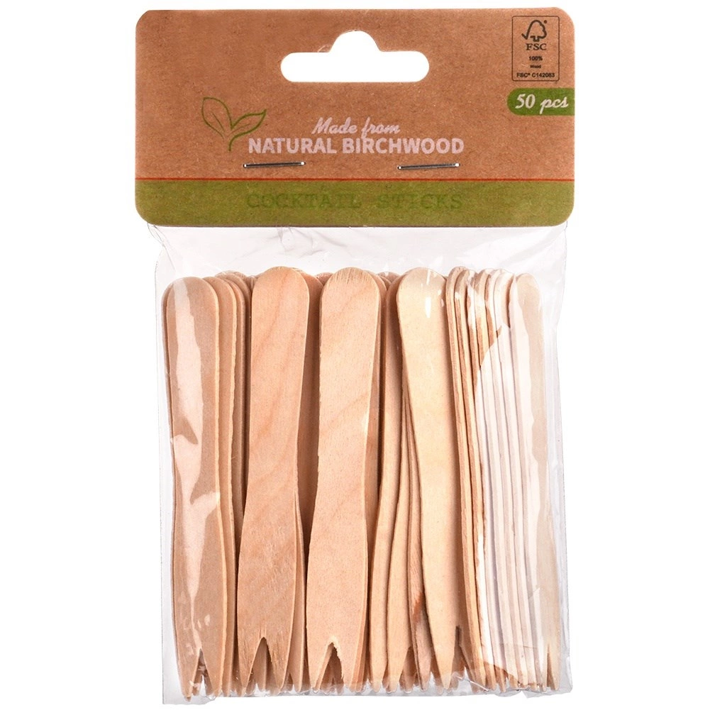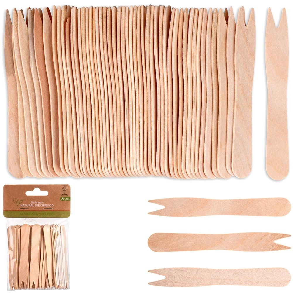 Praktične jednokratne drvene vilice duljine 8,5 cm u pakiranju 50 kom za jednostavno posluživanje i konzumaciju snackova. Izrađene od prirodnog brezovog drva, čvrste, lagane i otporne na lomljenje. Idealne za pomfrit, voće, sireve, povrće ili mini sendviče. Ekološke i biorazgradive, izvrsna alternativa plastici.