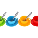 Čajnik, 4 šalice, 4 tanjurića, 4 žličice (šarena kombinacija)