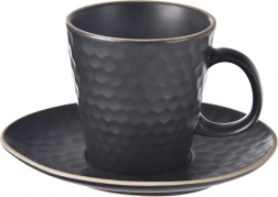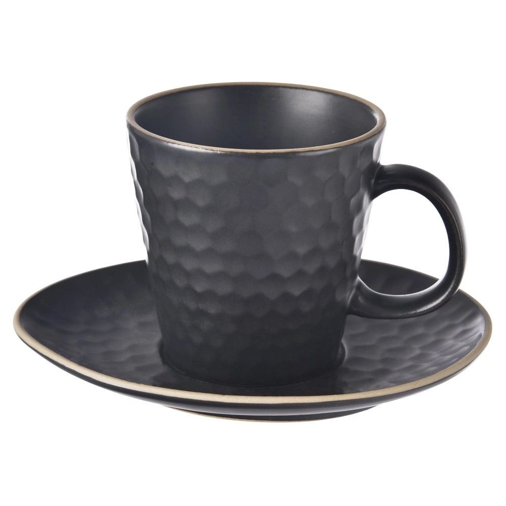Otkrijte šalicu za espresso koja spaja bezvremenski dizajn i praktičnu upotrebu. Crna kamenina s nježno mat efektom naglašava reljefnu heksagonalnu strukturu, zahvaljujući kojoj šalica i tanjurić djeluju elegantno i vrlo moderno. Savršena veličina od 95 ml jamči puni okus vašeg espressa.