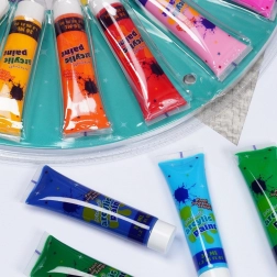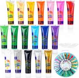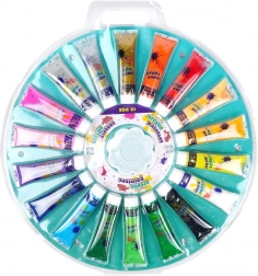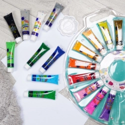 U pakiranju se nalazi 18 nijansi uključujući zlatnu sa šljokicama, srebrnu sa šljokicama, neonsku i biserne tonove – sve spremno za miješanje na priloženoj paleti. Akrili izvrsno prianjaju na razne površine, a nakon sušenja su otporni i postojani.