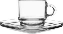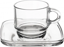 Prozirno staklo naglašava boju i kremu espressa, dok kvadratni tanjurić daje moderan izgled i praktičnu stabilnost.
