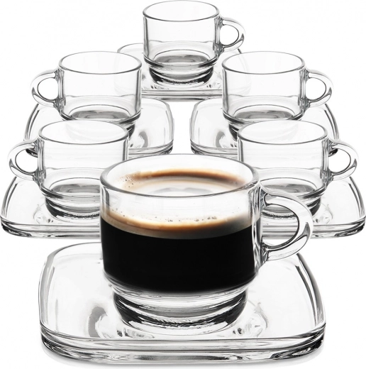 Uz ovaj set od 6 staklenih šalica za espresso uživat ćete u kavi kao u kafiću. Transparentno staklo ističe boju i kremu, dok kvadratni tanjurić daje posluživanju elegantan izgled i hvata eventualne kapljice. Zahvaljujući kompaktnim dimenzijama, set je savršen za svakodnevne kavene rituale.