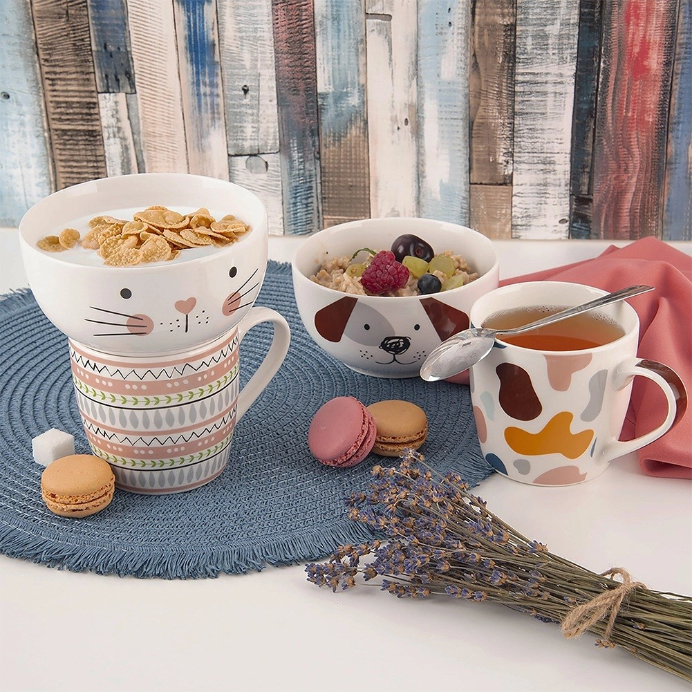 Zdjelica i šalica zajedno čine razigrani motiv mačjeg lica. Djeca se više vesele jelu, a blagovanje postaje zabava.