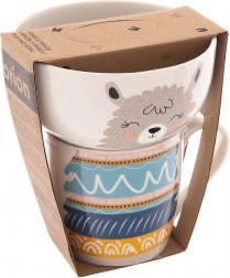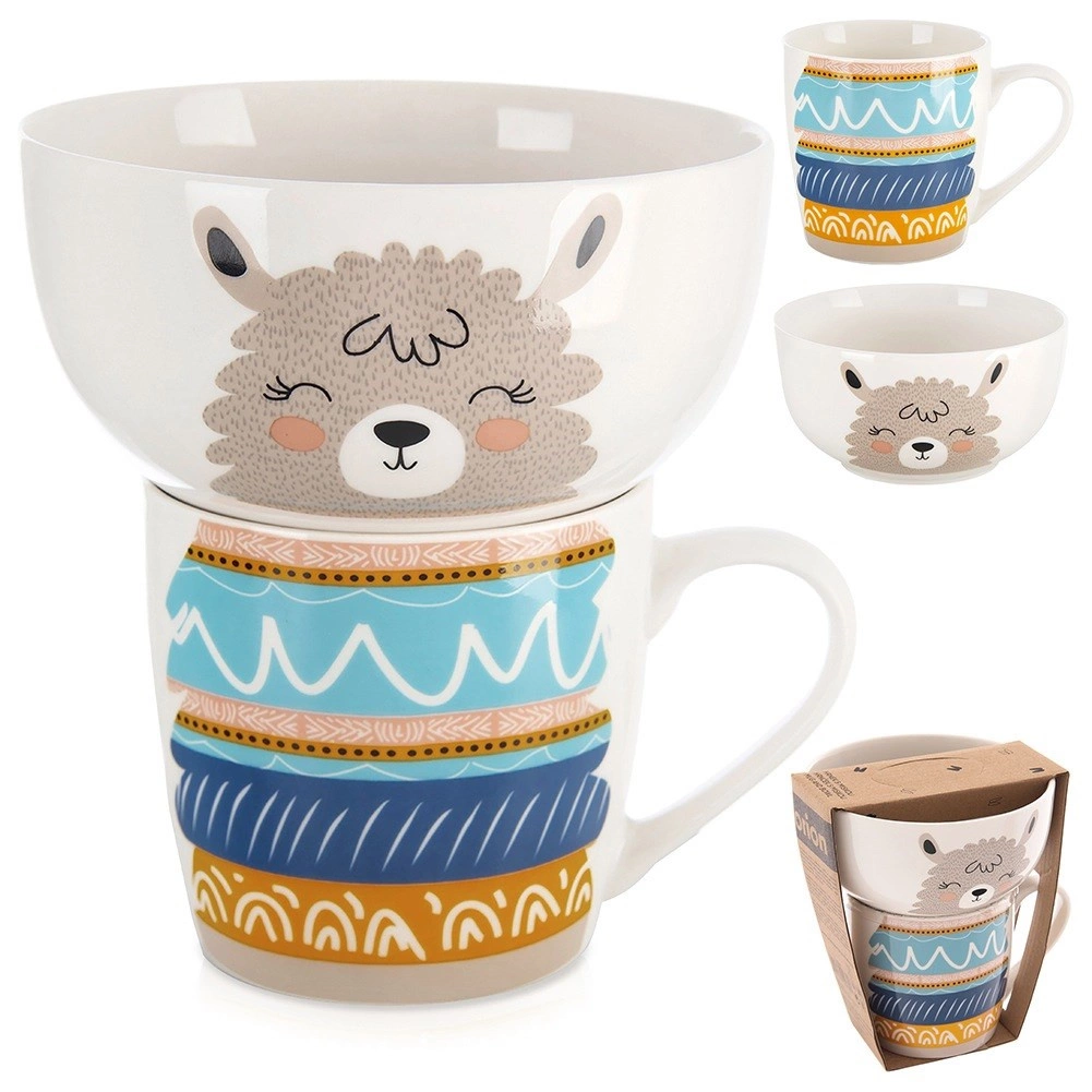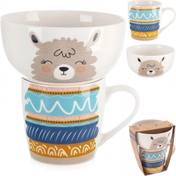 Šalica i zdjelica zajedno stvaraju sliku lame. Razigrani tisak potiče radost pri jelu i uljepšava svaki obrok.