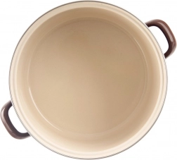 Emajlirani lonac u retro stilu oduševljava čvrstom izradom, velikom zapreminom i univerzalnom uporabom u kuhinji. Vanjsko smeđe izvedenje, kremasta unutrašnjost i nehrđajući rub daju posuđu elegantan izgled. Emajl je zdravstveno neškodljiv i prikladan i za alergičare.