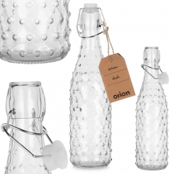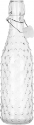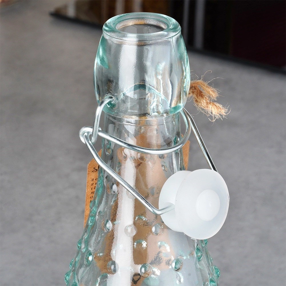 Elegantna staklena boca zapremine 500 ml u retro stilu idealna je za domaće limunade, sirupe, likere ili ulja. Ima patentni zatvarač s kopčom i silikonskom brtvom za maksimalnu nepropusnost i dulju svježinu sadržaja. Kvalitetno prozirno staklo s dekorativnim reljefom omogućuje efektan prikaz napitka kod kuće i u gastronomiji.