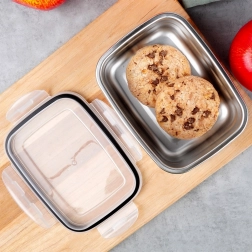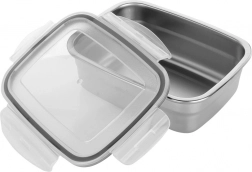Prozirni poklopac s gumenom brtvom i 4 robusne kopče osigurava pouzdano zatvaranje bez curenja. Posuda od nehrđajućeg čelika bolje održava željenu temperaturu jela – toplih i hladnih – te je otporna na mirise i mrlje. Spremnik se može praktično prati u perilici posuđa.