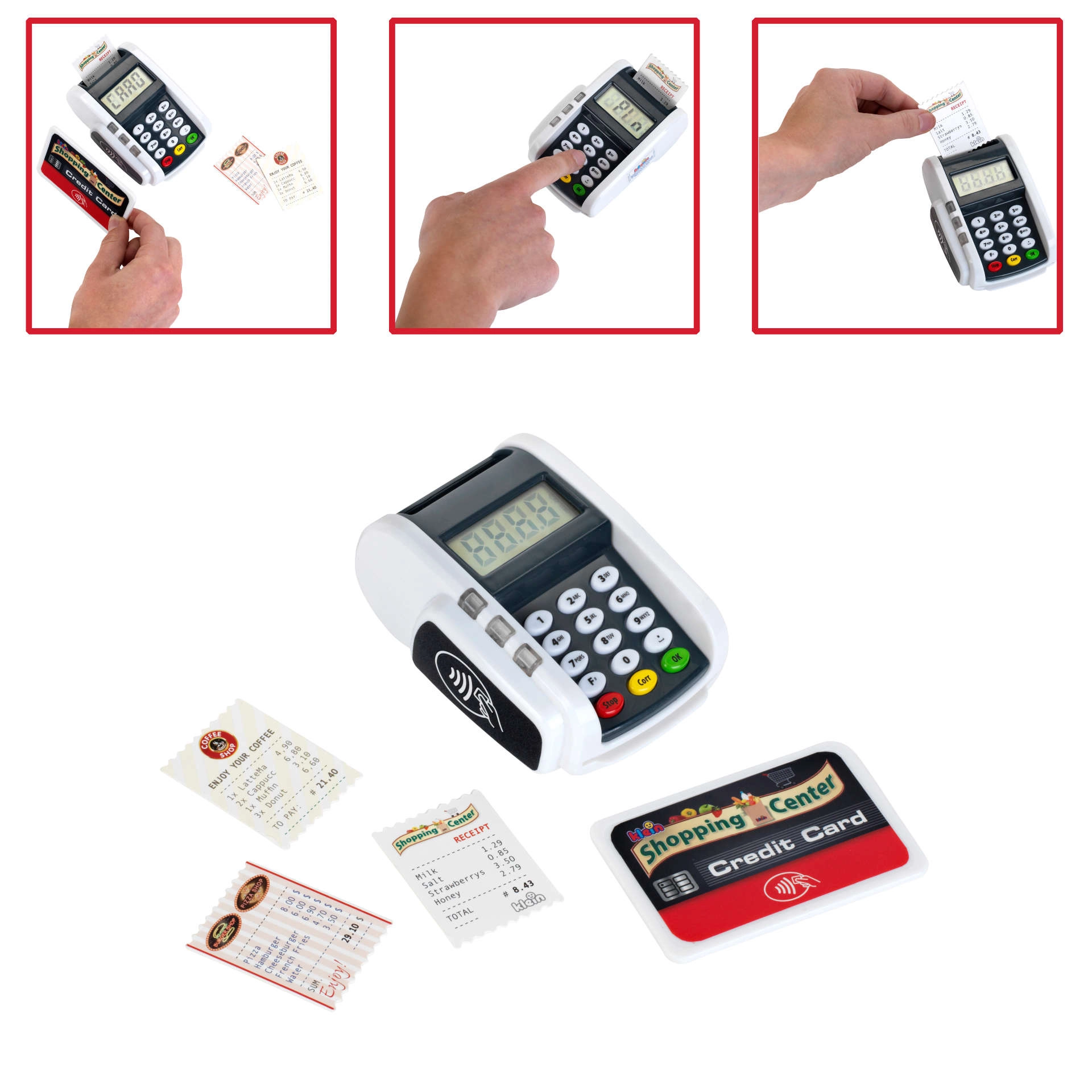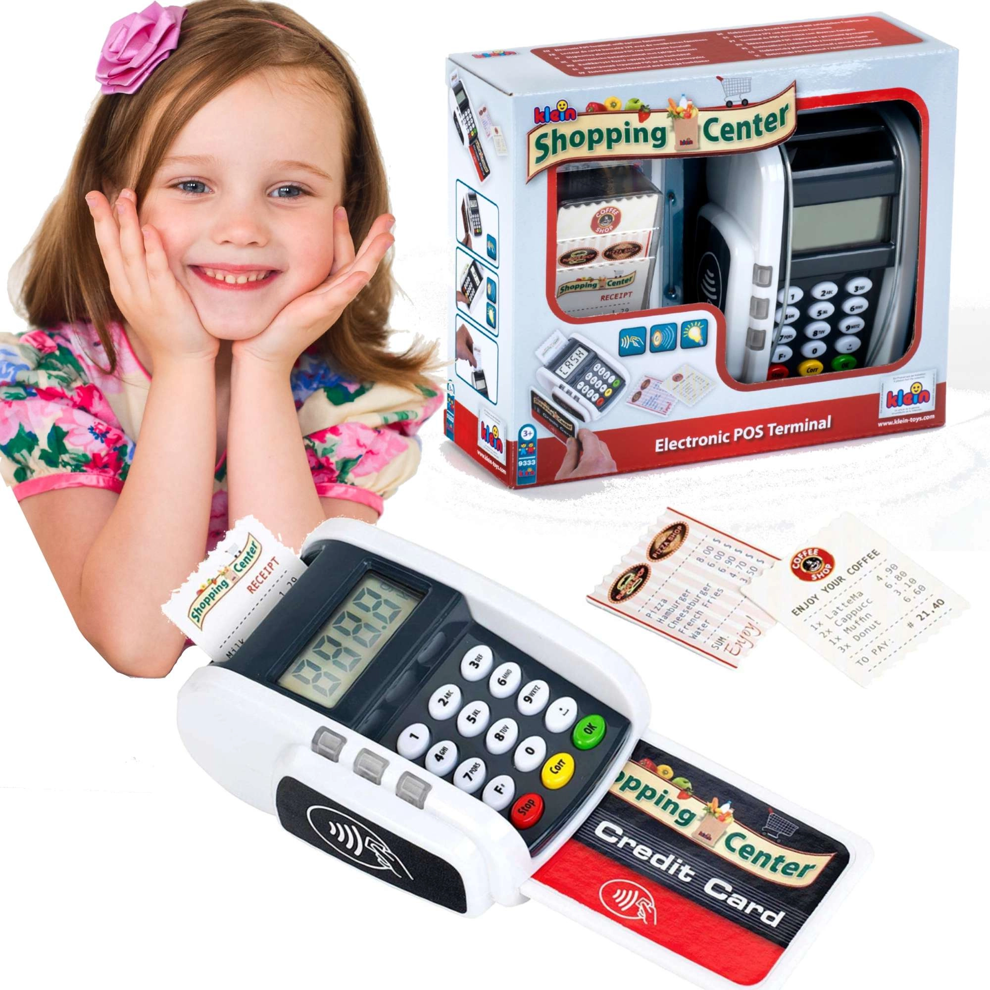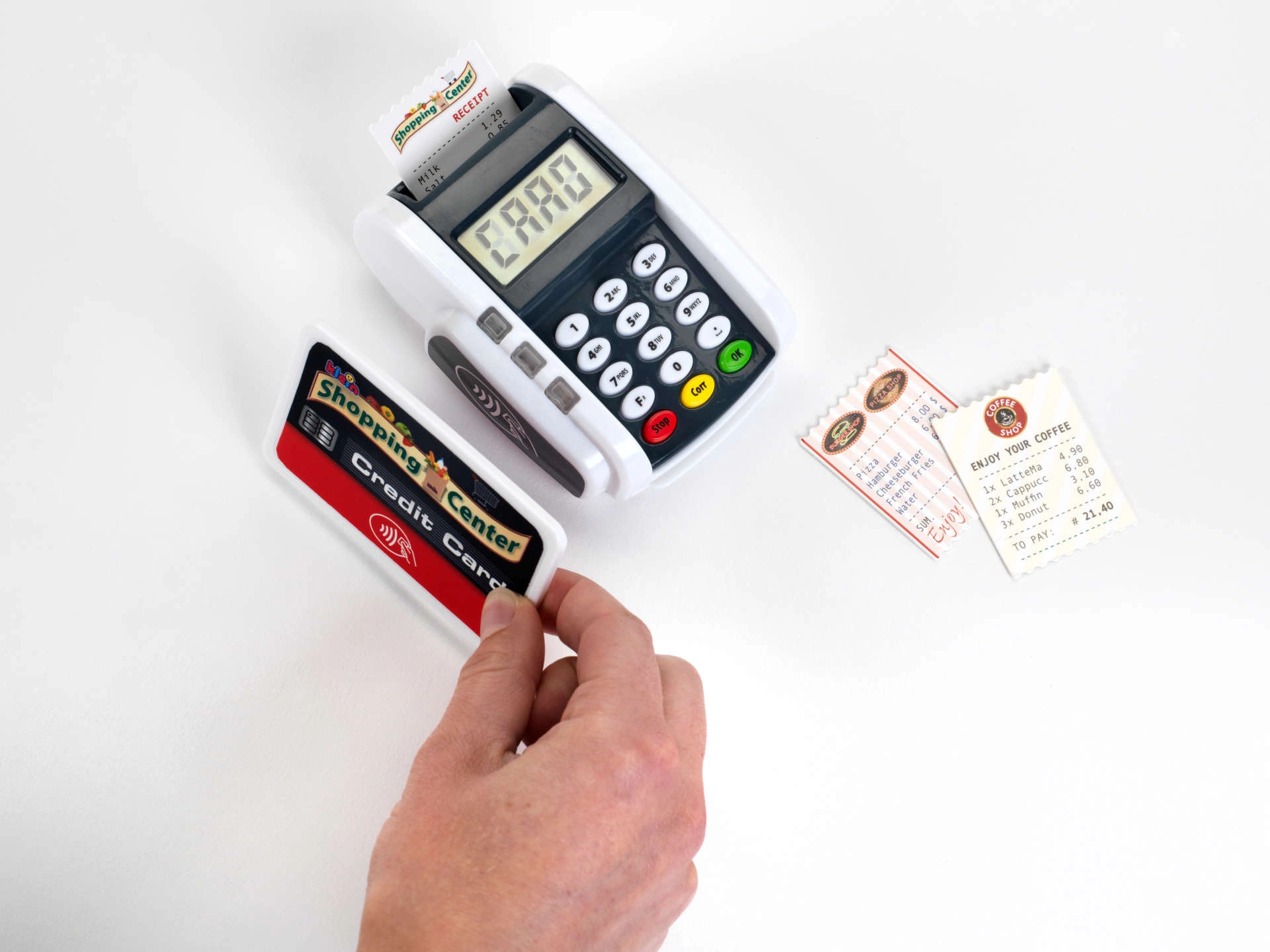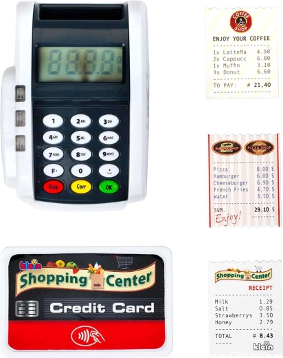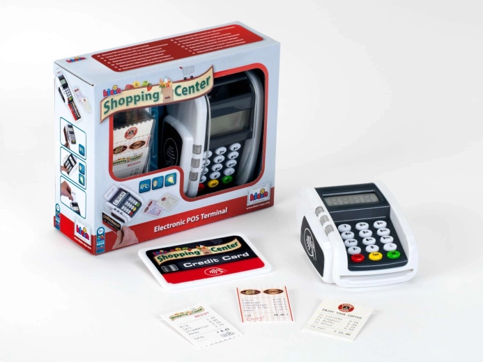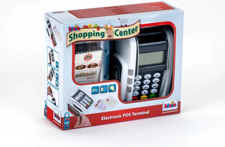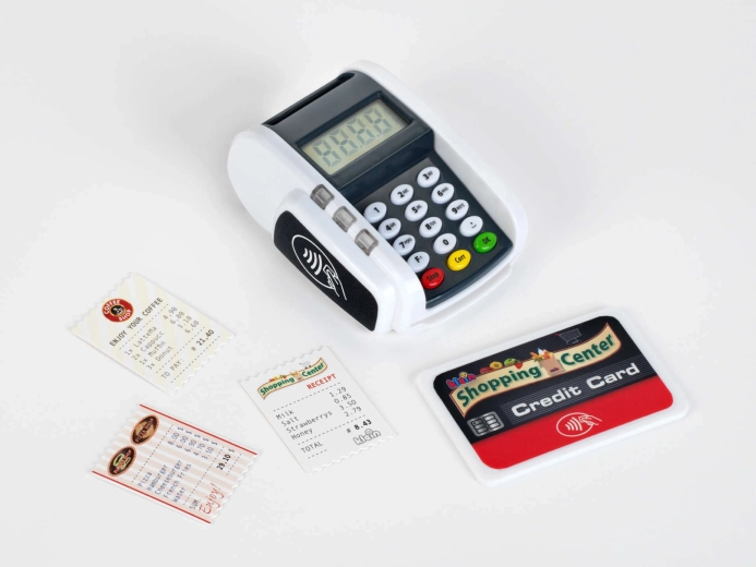 Ovaj kompaktan terminal vjerno oponaša stvaran uređaj: djeca mogu pritiskati numeričku tipkovnicu, prislanjati platnu karticu i „printati račune” za realističnu igru blagajne. Svjetlosni i zvučni efekti svakoj transakciji daju pravi dojam stvarnosti i potpomažu razvoj socijalnih vještina.