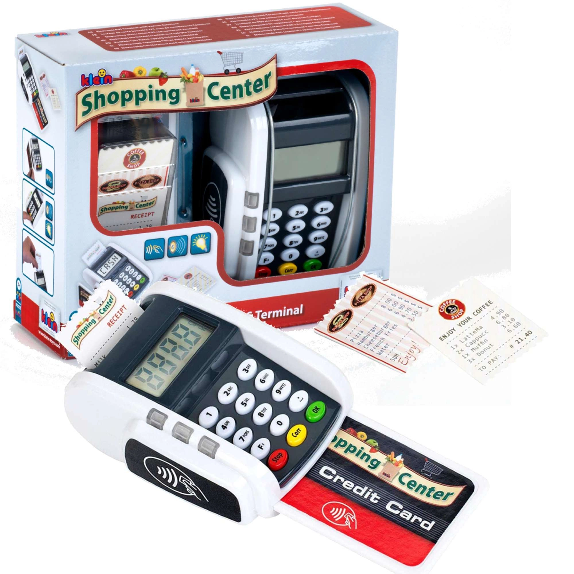 Realistični dječji platni terminal marke KLEIN donosi zabavu kao na blagajni. Nudi funkcionalne tipke, čitač beskontaktnog plaćanja, svjetlosne i zvučne efekte te djeci omogućuje na razigran način razvijati maštu kroz igru trgovine ili restorana.