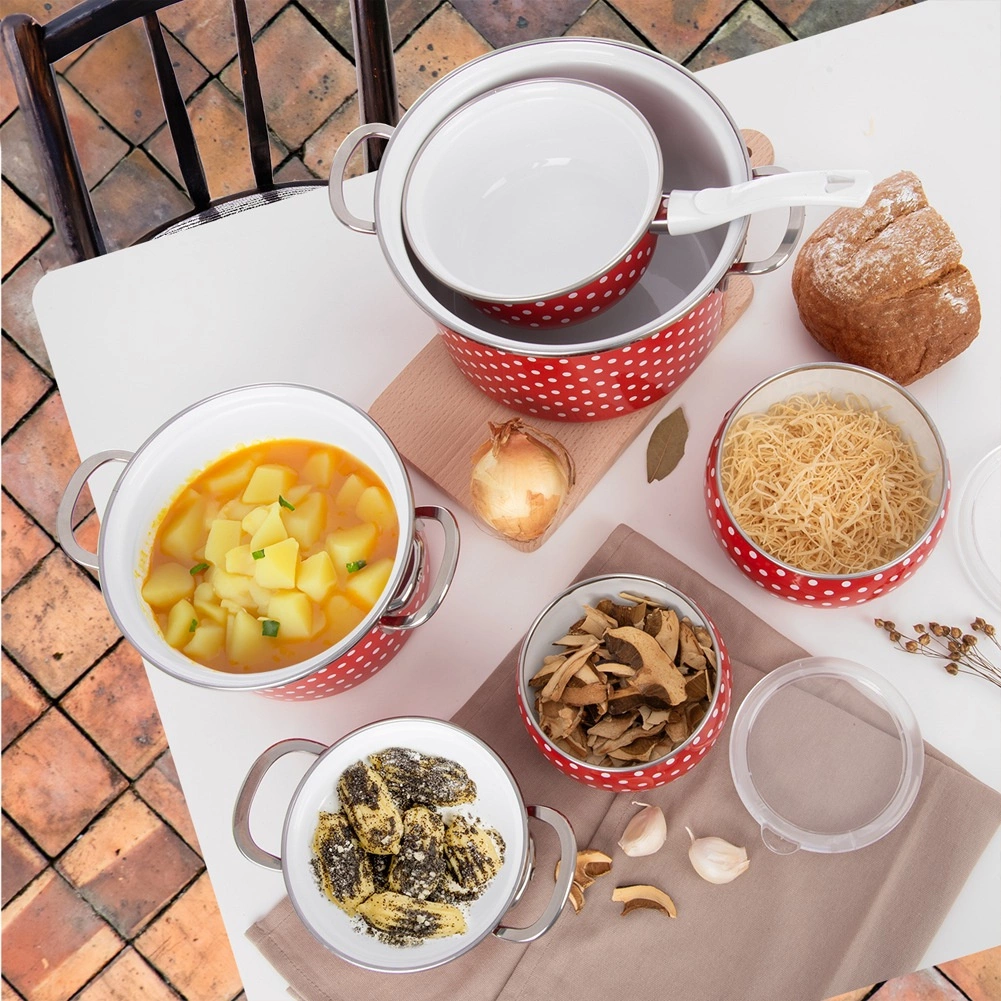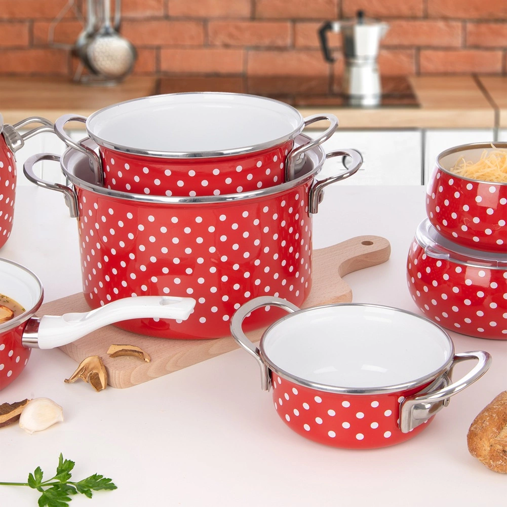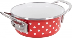 Stilizan i praktičan lonac od kvalitetnog emajliranog čelika u crvenoj boji s bijelim točkicama oživjet će svaku kuhinju. Robusna izrada, inox obruč i ručke osiguravaju dug vijek trajanja i udobno rukovanje. Kompaktna veličina savršena je za manje porcije, podgrijavanje, kuhanje i pirjanje.