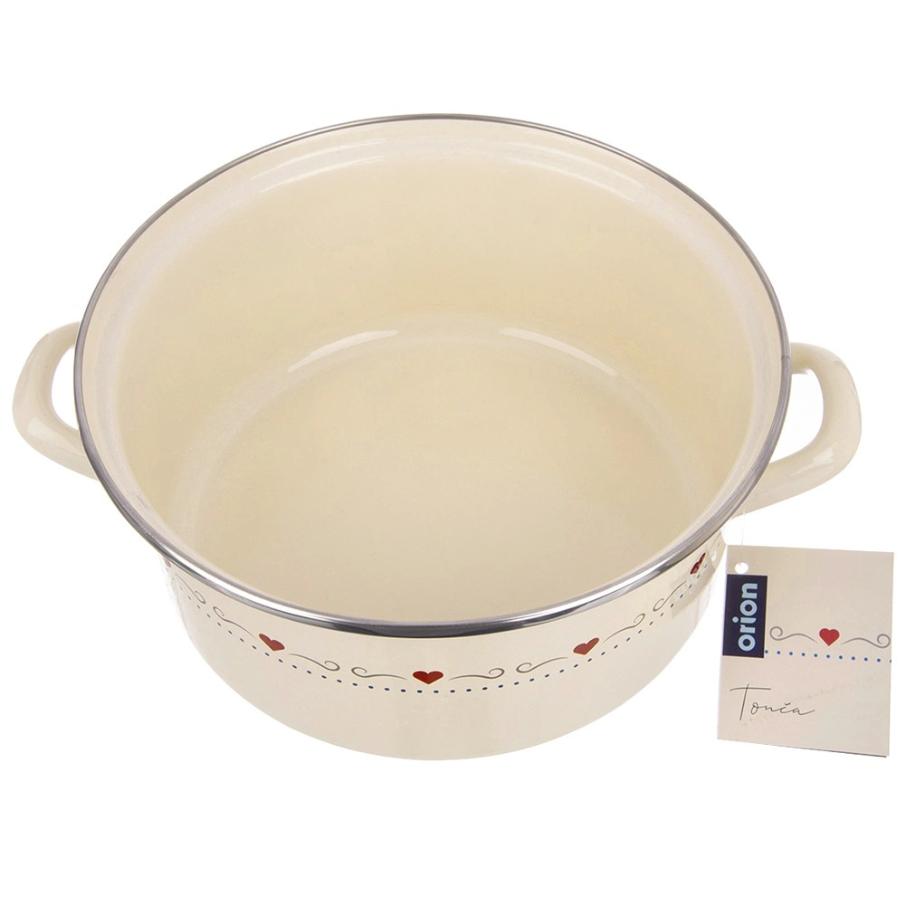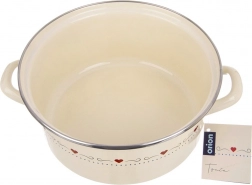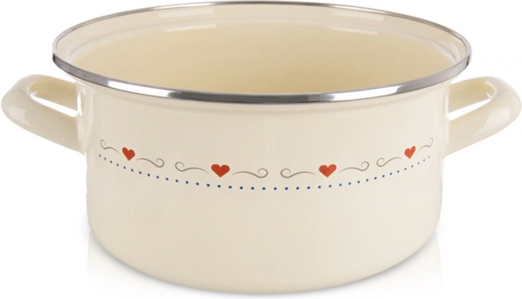 Elegantni emajlirani lonac zapremine 4 l u krem boji s nježnim motivom srca idealan je za kuhanje i pirjanje svakodnevnih jela. Zahvaljujući kvalitetnom emajliranom čeliku, nehrđajućem rubu i čvrstim ergonomskim ručkama pruža izdržljivost, siguran prihvat i jednostavno održavanje. Pogodan za sve vrste štednjaka, uključujući indukciju, kao i za pećnicu, uz mogućnost pranja u perilici posuđa.