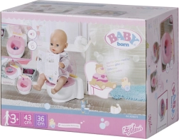 BABY born već ide na WC! Čim sjedne na svoj bijeli tron s ružičastim sjedištem, čut ćeš zvukove piškjenja, pljeska i veselog smijeha. BABY born se zna i pokakati. U tom slučaju u školjci se pojavi šareno, svjetlucavo kaka. Brzo, vrijeme je za ispiranje! Kada pritisneš gumb za ispiranje, kaka nestane i čuju se zvukovi ispiranja.