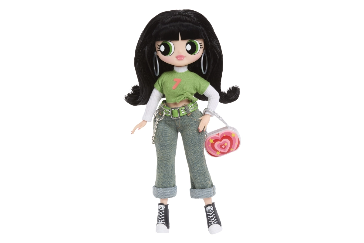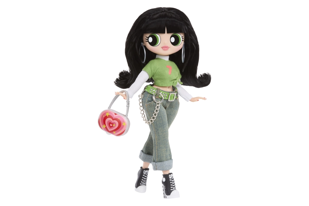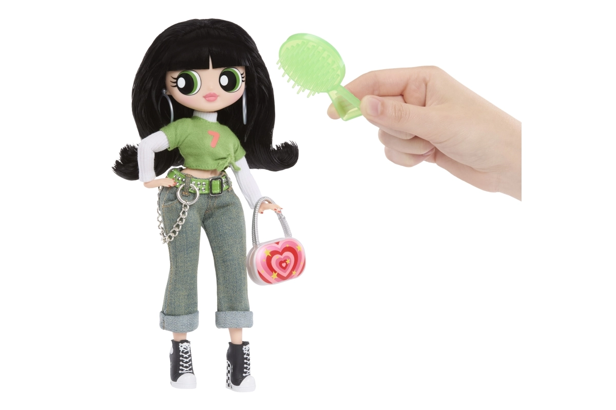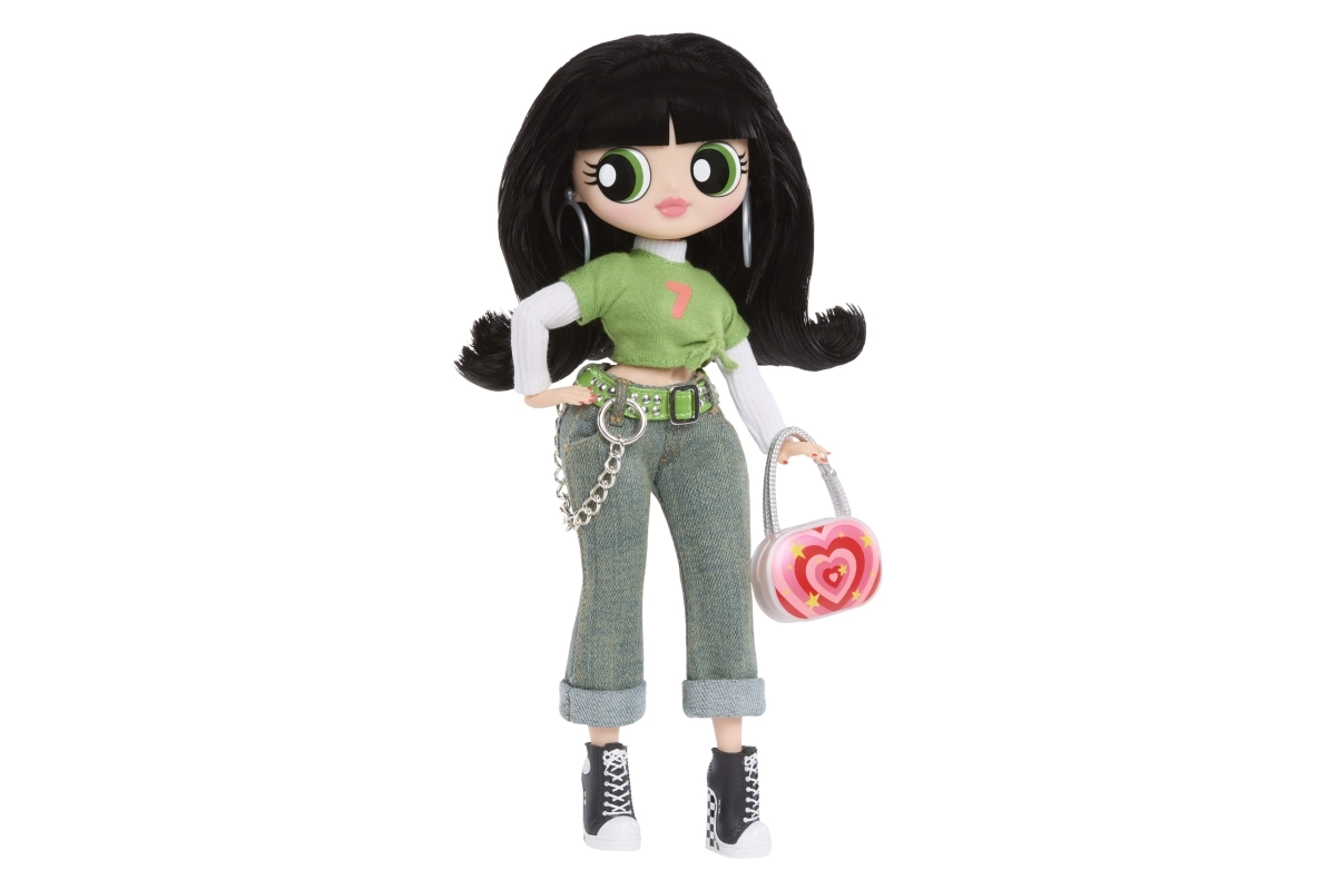 Zeleni crop top, traperice s lančićem i crne tenisice upotpunjuju efektna torbica i naušnice – ikoničan izgled Buttercup u L.O.L. izdanju.