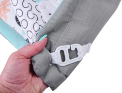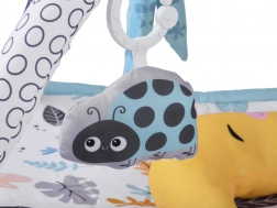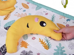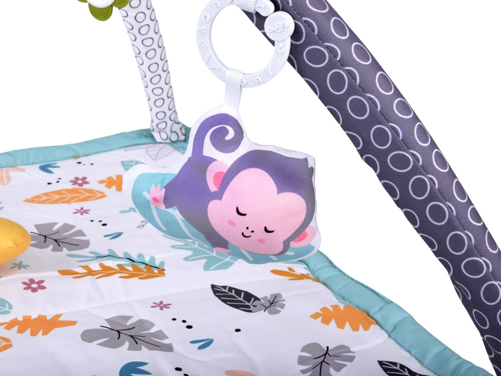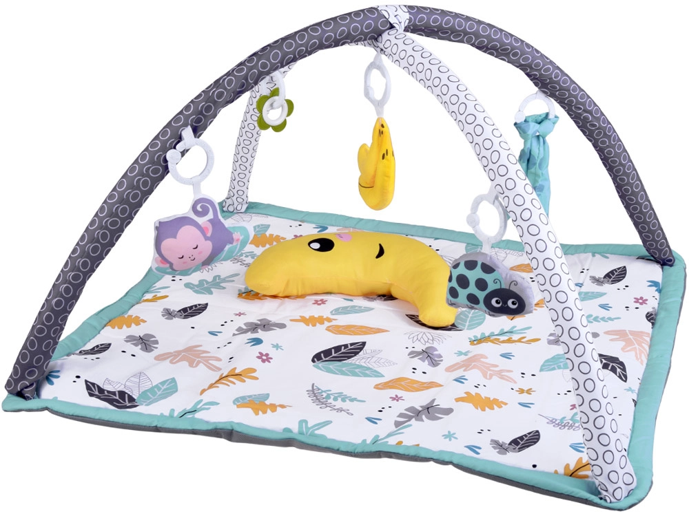 Ova višenamjenska podloga za igru u nježnom skandinavskom stilu pružit će bebi udobno i izolirano mjesto na podu. Dva križana luka s visećim igračkama (bananica, bubamara, majmunčić, cvjetić–grickalica i druge) potiču pružanje i hvatanje, što prirodno jača ruke, vrat i trup te podupire koordinaciju oko–ruka. U kompletu je i mekani potporni jastučić, idealan za tummy time.