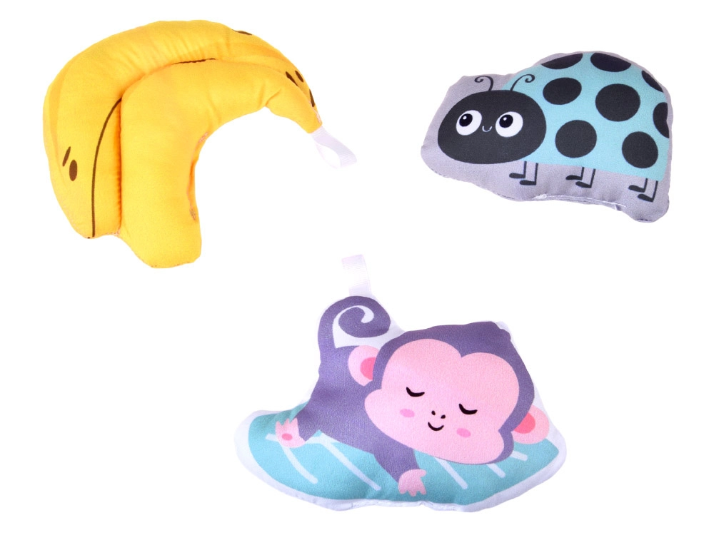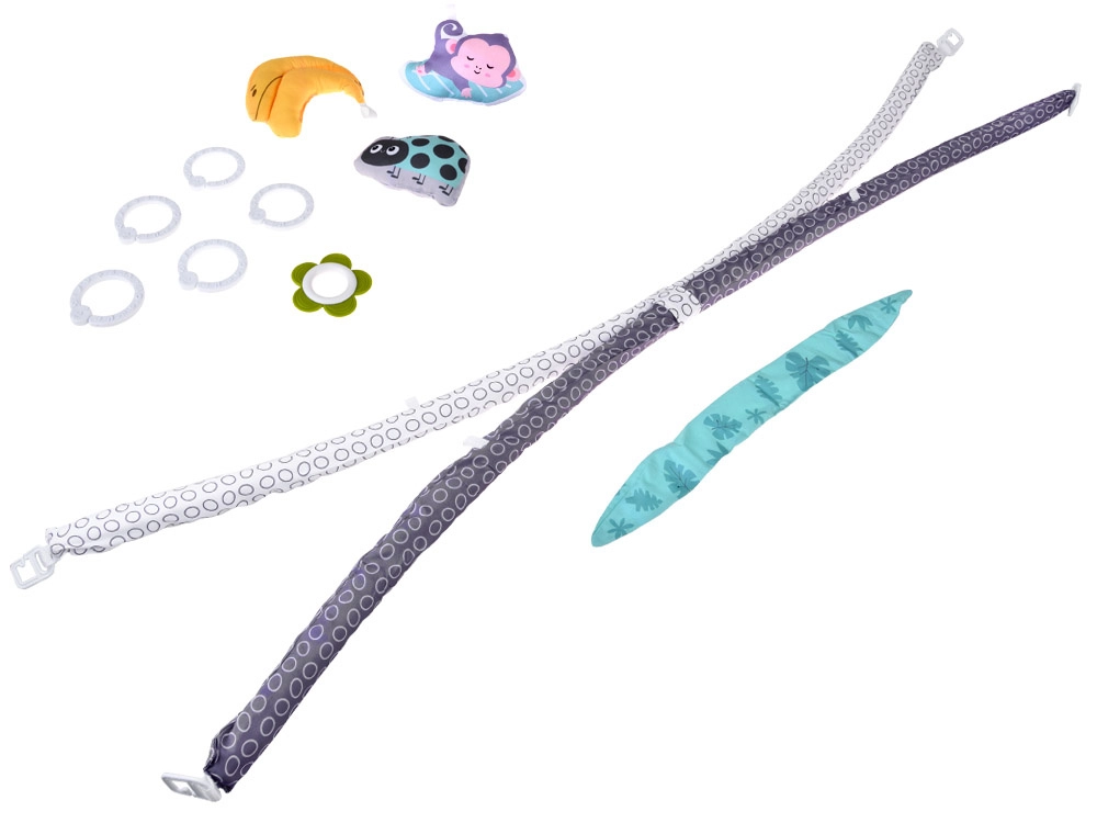 Viseće igračke, uključujući šuškajuće listiće, mekanu majmunčić igračku sa zvečkom, tekstilnu bananu, simpatičnu bubamaru sa zvončićem i cvjetić–grickalicu, motiviraju bebu na istraživanje i hvatanje.
