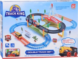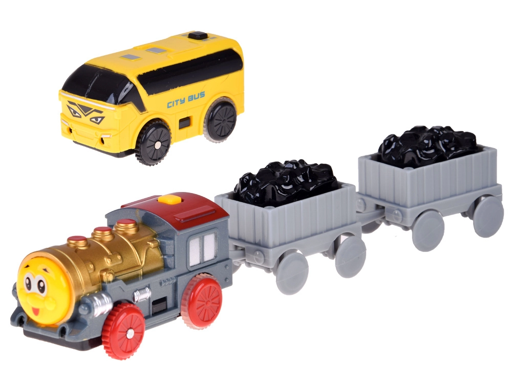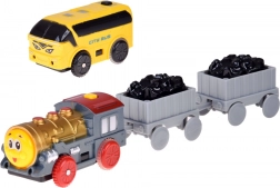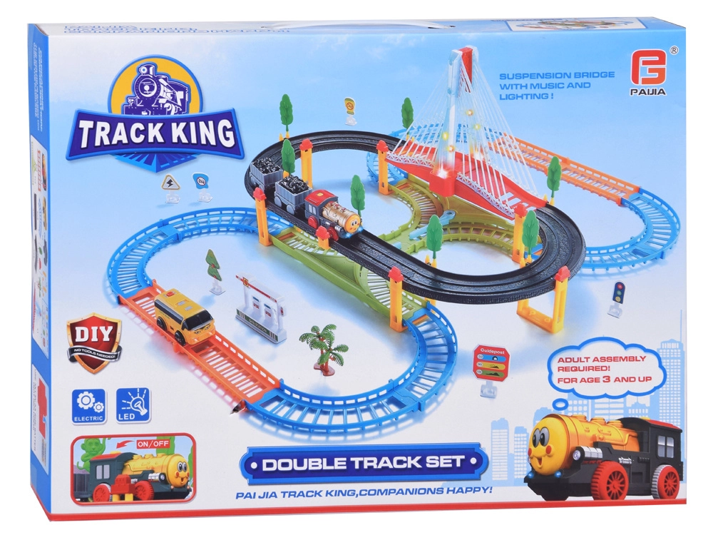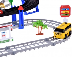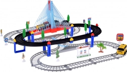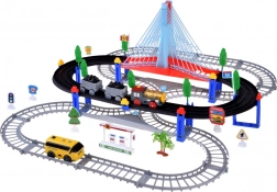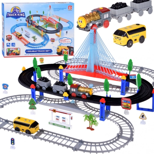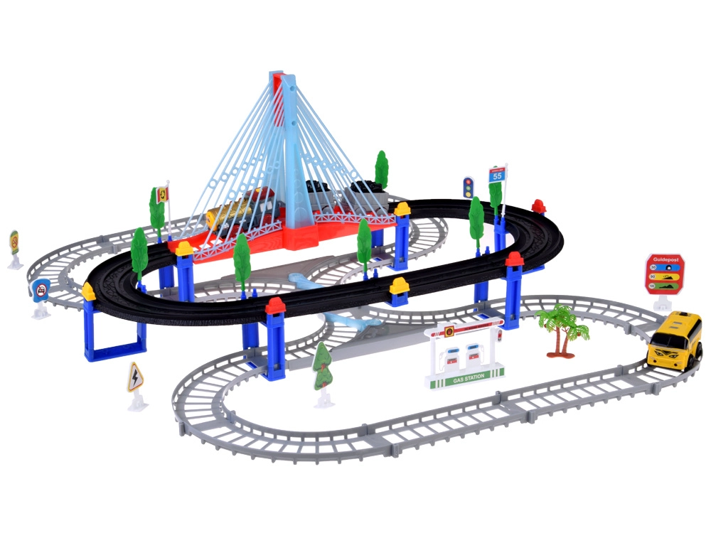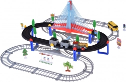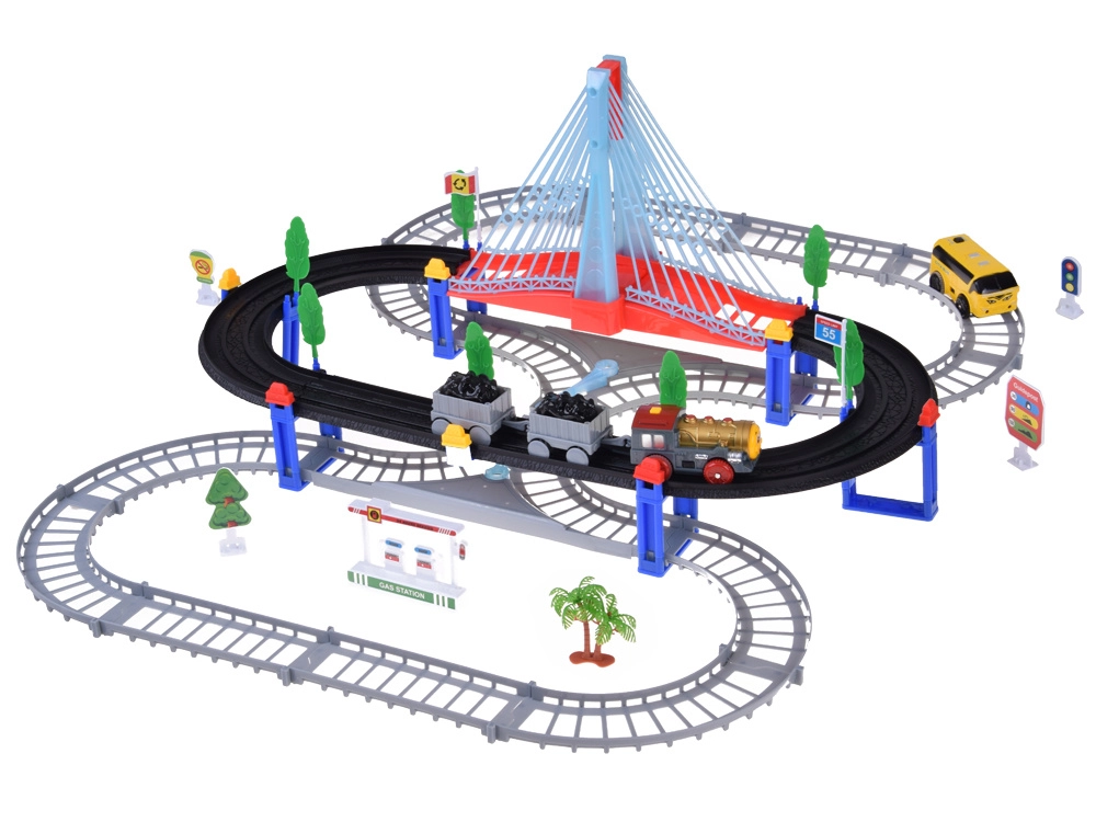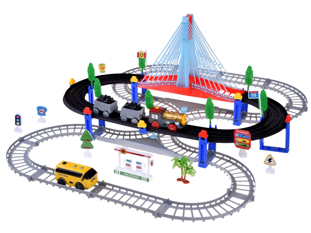 Ova električna željeznička staza s višerazinskim tračnicama i visećim mostom donosi djeci sate kreativne igre. Lokomotiva s vagonima i žuti gradski autobus kreću se povezanim rutama, prelaze preko mosta i prolaze pokraj prometne signalizacije, drveća i male benzinske postaje. LED osvjetljenje te zvukovi lokomotive s melodijama daju igri autentičnost.
