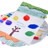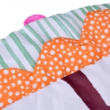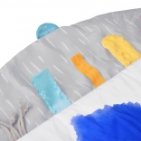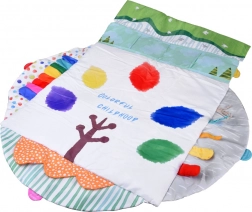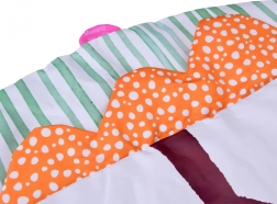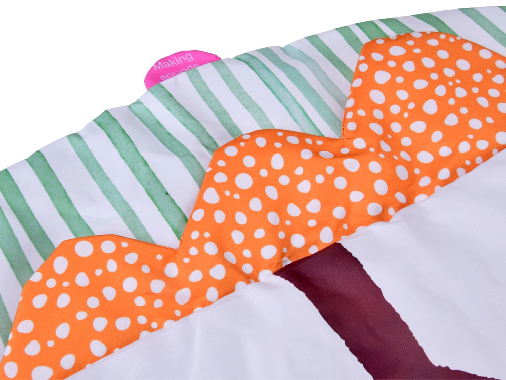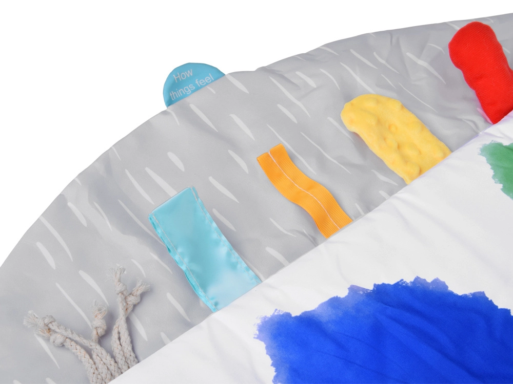 Ova velika, kružna dječja podloga nudi udobnu, podstavljenu površinu i varijabilnu upotrebu: kao igrovno gnijezdo s lukovima za vješanje igračaka ili kao samostalna podloga za slobodnu igru i vježbe na trbuhu. Visok kontrast uzoraka, raznolike teksture i nježni zvukovi prirodno stimuliraju osjetila te razvijaju finu i grubu motoriku.