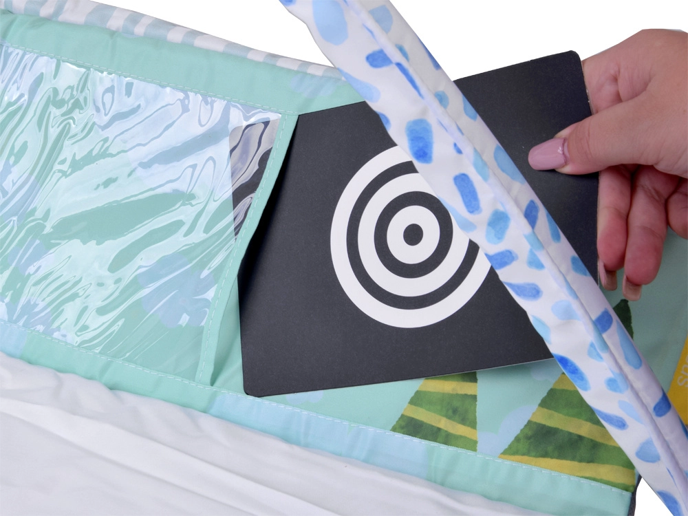 U paketu dolazi raznolik set dodataka: zrcalce za samoprepoznavanje, kontrastne kartice za vizualni razvoj, plišani viseći elementi, grickalice, zvečka i šuškavi detalji. Podloga se brzo sklapa, lagana je za prenošenje i jednostavna za održavanje – idealna kod kuće i na putovanju.