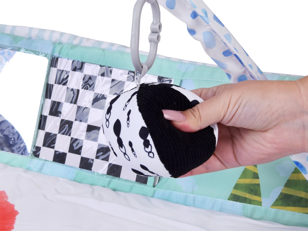 - Podloga, 2 luka, set visećih igračaka: zrcalce, kontrastne kartice, grickalice (zvjezdice), mekana kontrastna loptica, zvečka, šuškavi elementi