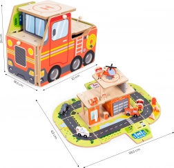 Drvena vatrogasna stanica 2u1 – sklopiva garaža i vozilo s 2 katova i dodacima ECOTOYS