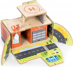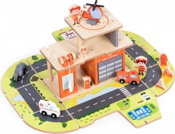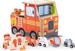 Drvena vatrogasna stanica 2u1 marke ECOTOYS u trenu se pretvara u kompaktno vatrogasno vozilo. Nudi 2 kata s garažom, toboganom i heliportom, kao i 11 elemenata uključujući vozila, figurice i pribor. Potiče maštu, učenje kroz igru i razvoj suradnje pri stvaranju napetih spasilačkih misija.