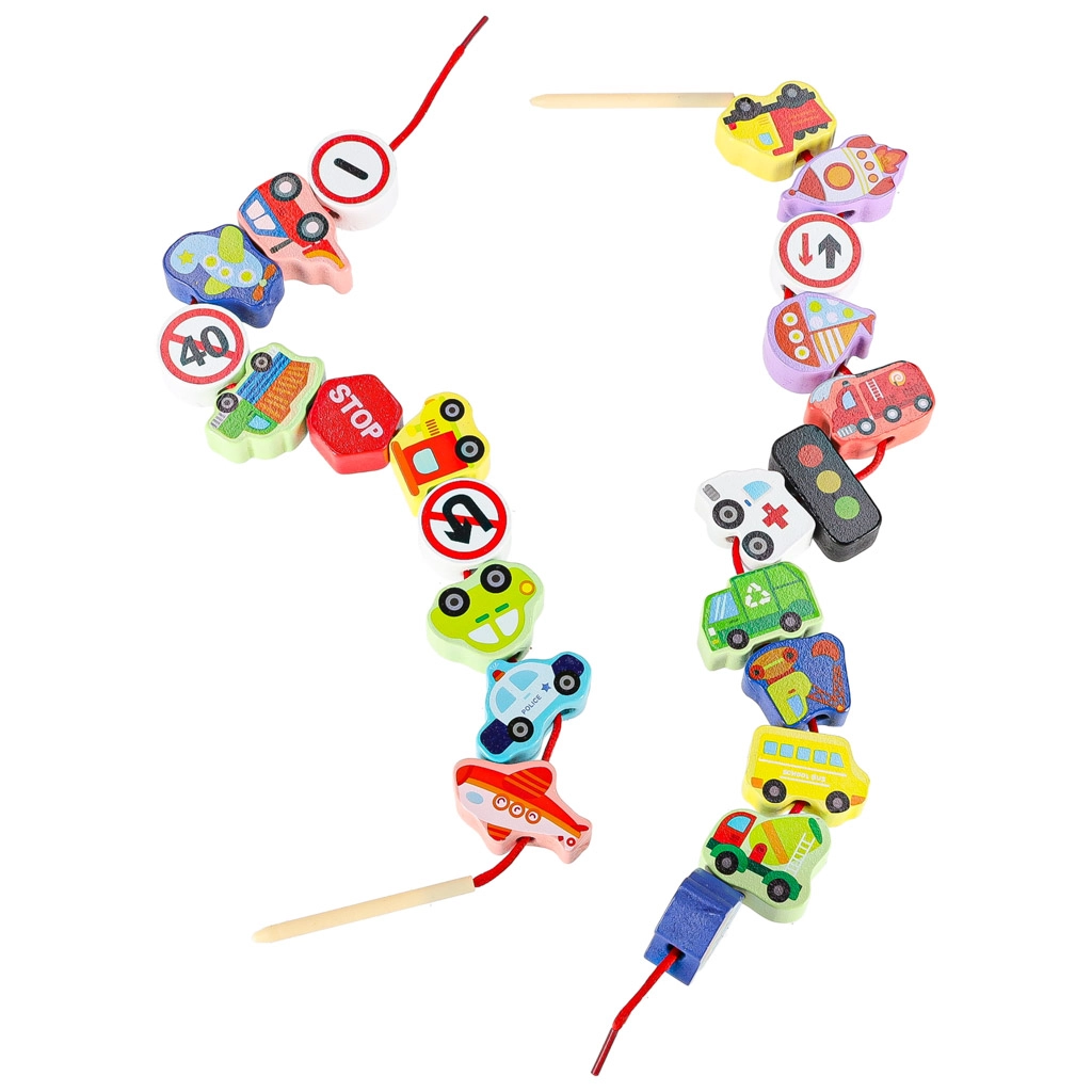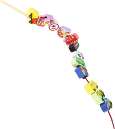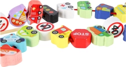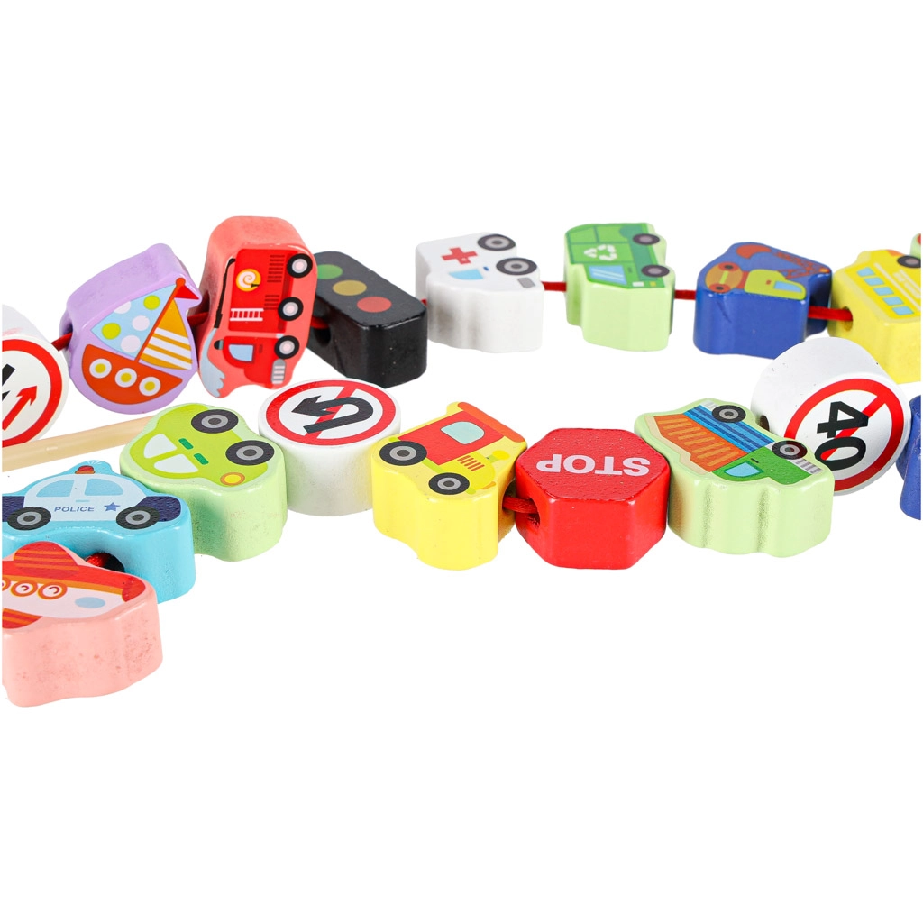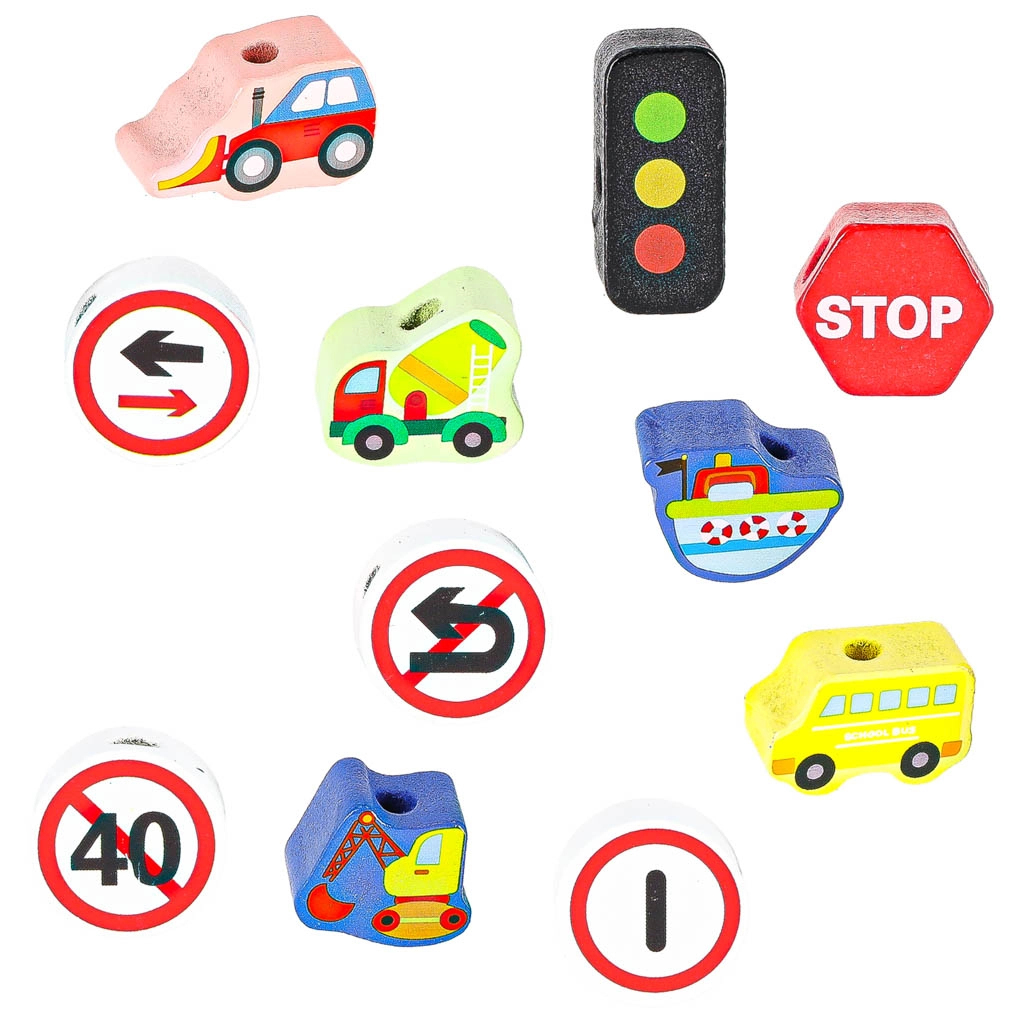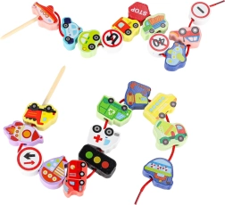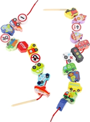 Ovaj set za nizanje s temom cestovnog prometa pomaže djeci usvojiti osnove pravila na cesti te istodobno razvija njihove vještine kroz igru. Raznovrsni oblici (automobili, autobusi, vozilo hitne pomoći, vatrogasno ili teretno vozilo, semafori, znakovi) potiču na stvaranje i bude maštu. Zahvaljujući drvenoj izradi s glatkom površinom, perle se lako drže i udobno nižu.