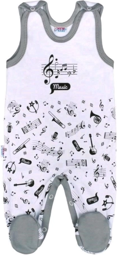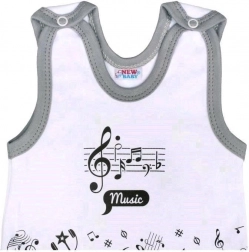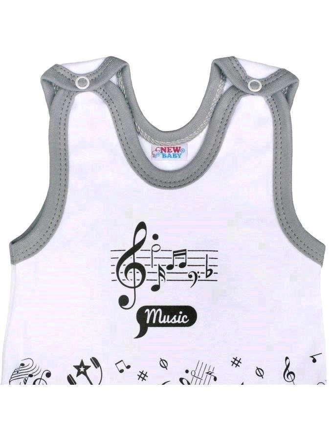 Udobne dječje benkice od 100% pamuka s veselim glazbenim motivom NEW BABY MUSIC. Praktično kopčanje na drukere na naramenicama i između nogica olakšava odijevanje i previjanje. Univerzalan dizajn idealan je za djevojčice i dječake.