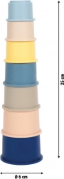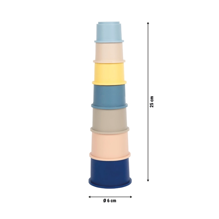 Čašice se umeću jedna u drugu radi uštede prostora. Izdržljiv materijal lako se čisti i prikladan je za igru u kući i na otvorenom.