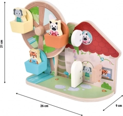 Ova šarena motorička igračka small foot pretvara dječju sobu u mali zabavni centar. Djeca će zavoljeti okretanje panoramskog kotača pomoću glatko tekuće ručice, smještanje drvenih životinjica u kabine i otkrivanje motiva iza šarenih vratašaca. Igračka prirodno razvija finu motoriku, koordinaciju oko–ruka i logičko razmišljanje, a ujedno potiče maštu i samostalno istraživanje.