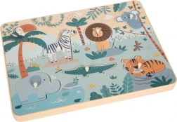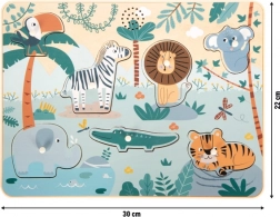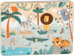 Drvena slagalica s umetanjem i zvukom pretvara prve korake učenja u avanturu. Djeca smještaju lava, tigra, slona, zebru, koalu, tukana i krokodila na prava mjesta, a pri podizanju dijela čuju autentičan zvuk životinje. Kvalitetna izrada od FSC® certificiranog drveta ugodna je na dodir i obzirna prema prirodi.