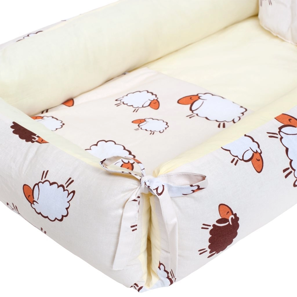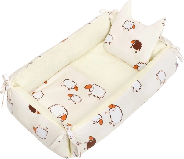 Multifunkcionalno dječje gnijezdo New Baby Ovčice bež stvara bebi ugodno i sigurno okruženje kod kuće i na putu. Zahvaljujući obostranom izvedbom lako ga možete prilagoditi trenutačnom raspoloženju ili interijeru. Rubovi povećavaju osjećaj sigurnosti, sprječavaju otkotrljavanje izvan gnijezda i pružaju dodatnu potporu.