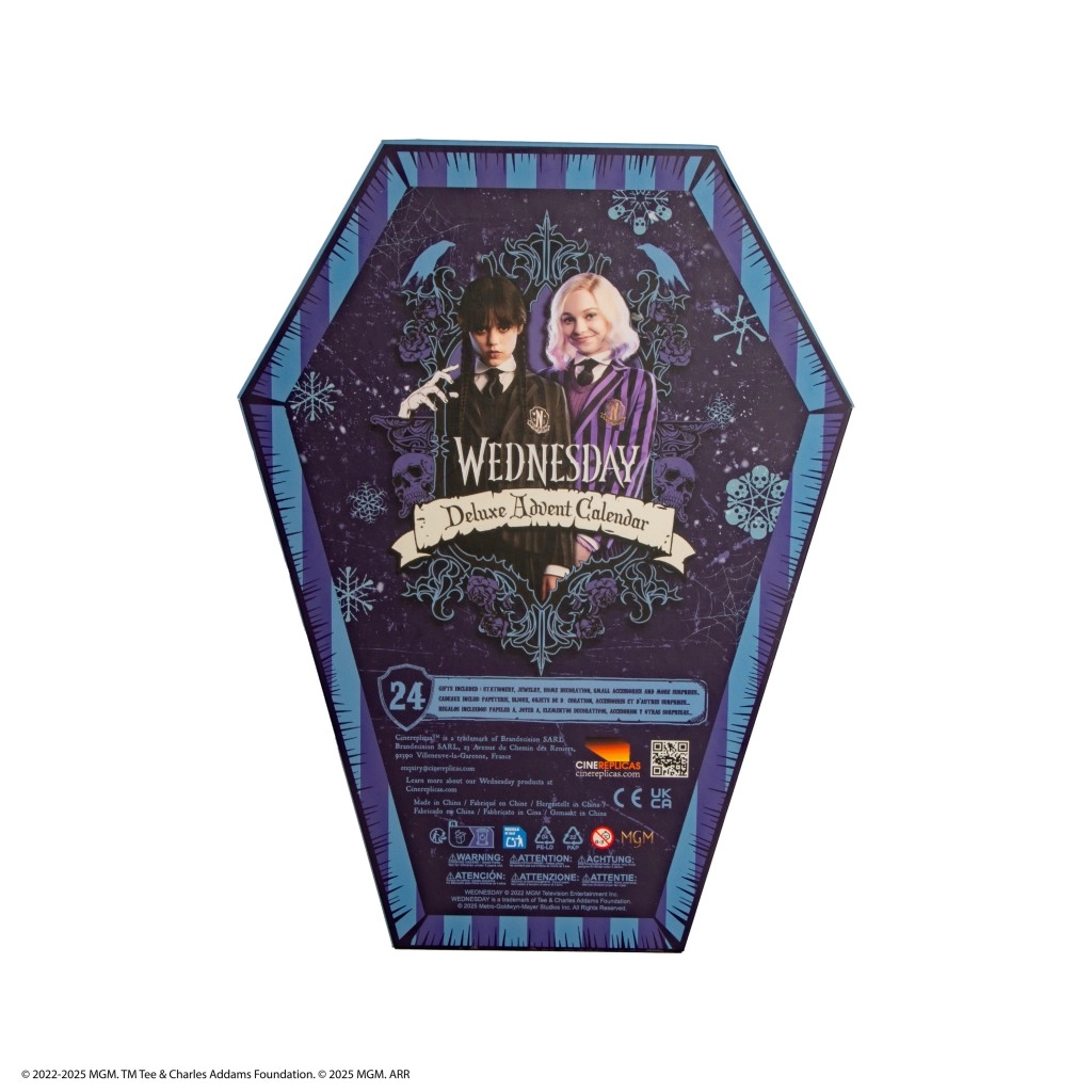 Ovaj ekskluzivni adventski kalendar u obliku lijesa oduševit će svakog obožavatelja WEDNESDAY. Unutra ćete pronaći pomno osmišljene pretince s 24 tematska iznenađenja koja spajaju zabavu, praktičnost i kolekcionarsku vrijednost. Zahvaljujući privlačnom dizajnu, kalendar je idealan i kao dekorativan poklon za blagdane.