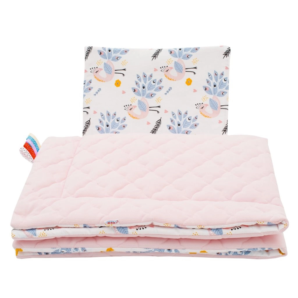 Ovaj elegantni obostrani set za kolica u ružičastoj boji s motivom paunova nudi savršen spoj praktičnosti i mekoće. Jedna strana je od kvalitetnog 100% pamuka s modernim dječjim tiskom, druga od velveta (100% poliester), koji je iznimno ugodan na dodir i dugotrajno zadržava oblik. Sve je ispunjeno antialergijskim vlaknom za sigurnost i udobnost osjetljive dječje kože.