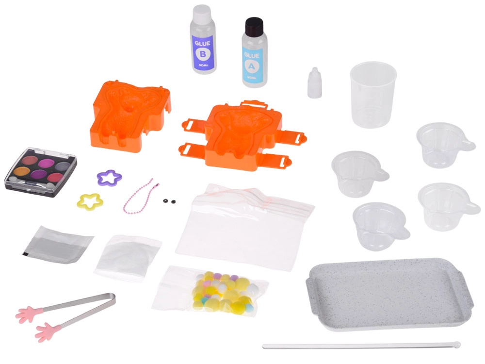 Set sadrži kalup, male kliješta, miješalicu, ljepila, pigment, meke kuglice, zvjezdice, oči, ukrasnu vrećicu, lančić i još mnogo toga – možete početi odmah.
