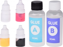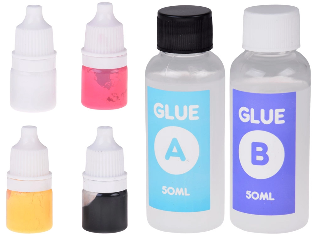 - Kalup za 4 sluzi, miješalica/špatula, plastični nožić, 2× ljepilo (A+B), mjerica, 4× bojilo, mekane ukrasne kuglice, zaštitne rukavice, 4× zvjezdica, 4× prozirna čašica, 4× ukrasna vrećica, 4× lančić za privjesak, pladanj