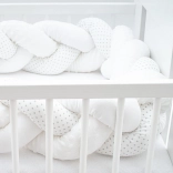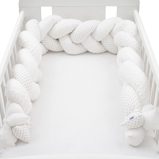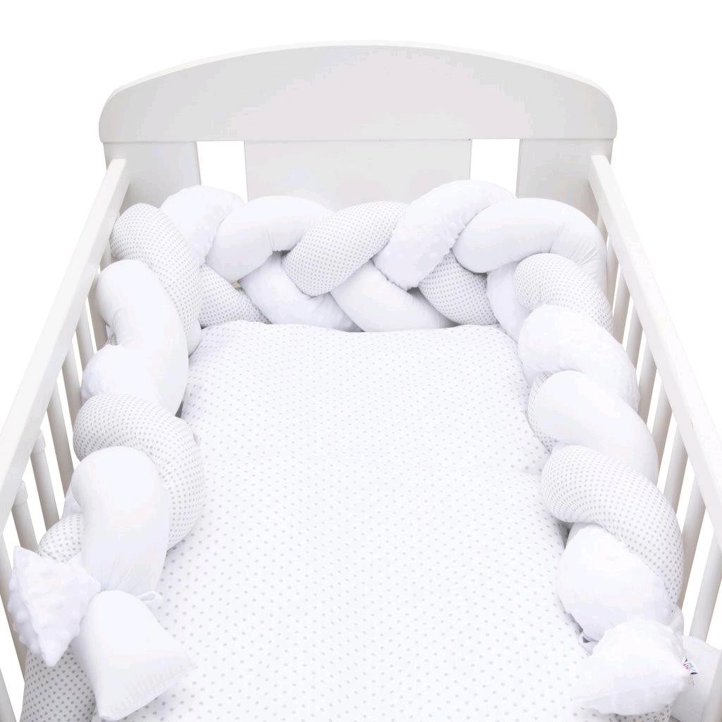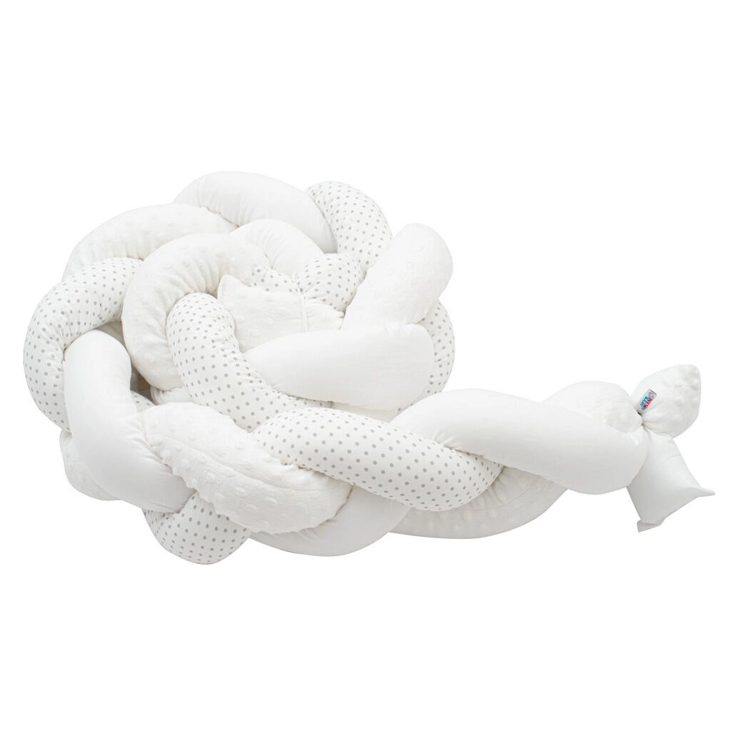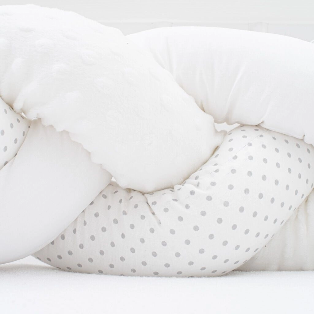 Mekana pletena zaštitna pletenica marke NEW BABY štiti bebu od tvrdih prečki krevetića i hladnoće zida. Antialergijsko punjenje, navlaka od 100% pamuka i ručno pletenje jamče sigurnost i udobnost. Univerzalna duljina 225 cm, jednostavno učvršćivanje pomoću 3 priložene vrpce, elegantan sivi dizajn s minky i točkicama.